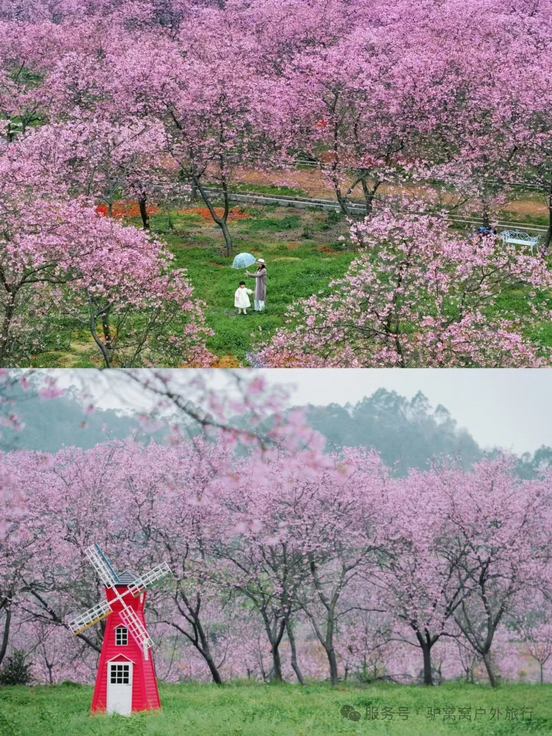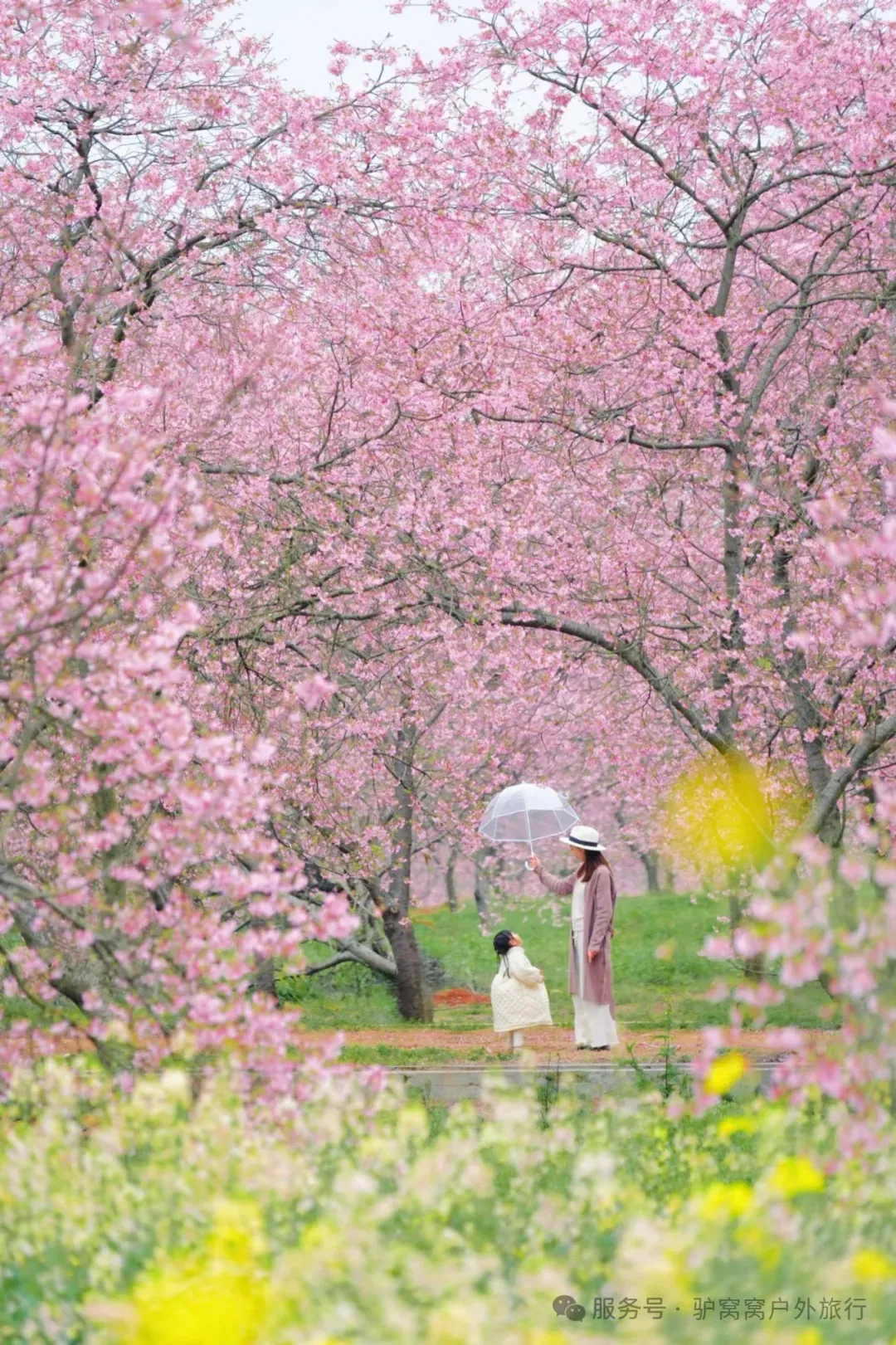 午餐后驱车前往韶关樱花园。在韶关的春日里,樱花园是大自然馈赠的最美礼物。这里的樱花,在青山绿水的映衬下,显得格外清新脱俗。漫步在樱花小径上,脚下是柔软的草地,身旁是娇艳的樱花,空气中弥漫着淡淡的花香,让人感到无比的惬意与放松。园区内还有160多亩彩色油菜花与樱花同步绽放,粉的、红的、黄的花朵相互交织,与周围的自然景观融为一体,宛如一幅天然的田园画卷,让人心旷神怡。