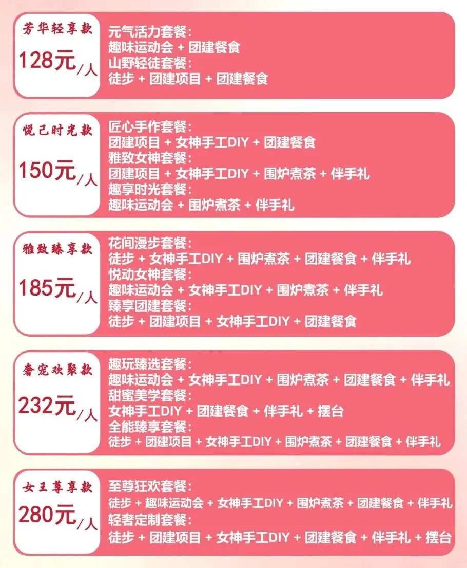 为满足不同团队的需求,我们定制了13 款专属团建套餐,价格从 128 元 / 人至 280 元 / 人不等,趣味运动会、徒步、手工 DIY、团餐、围炉煮茶、伴手礼等内容自由组合,按需选择,一站式搞定女神节团建,不用费心策划,超省心!