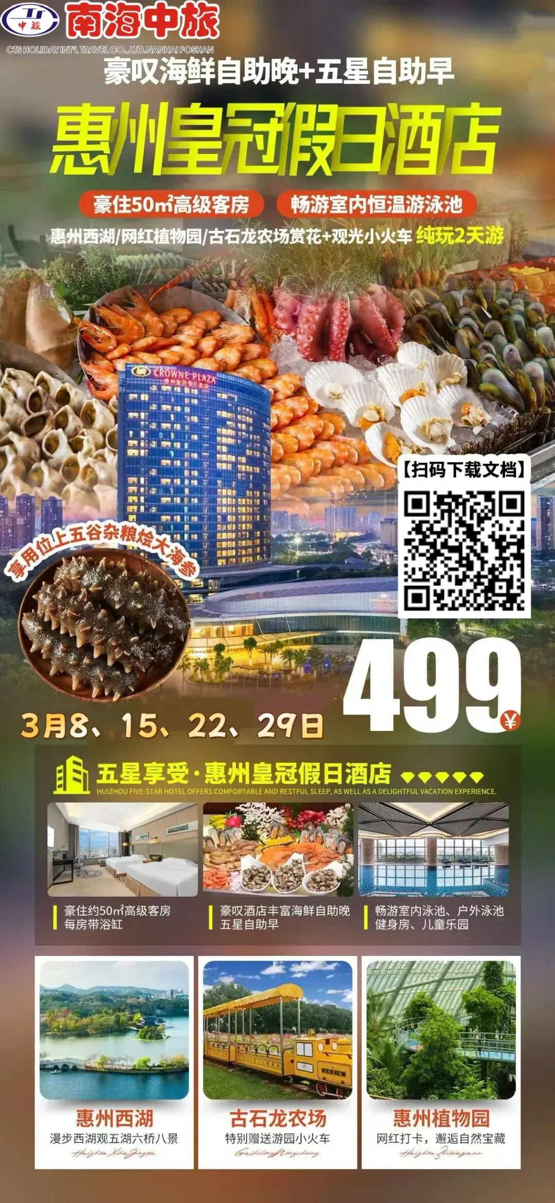 含酒店丰富海鲜自助早餐+自助晚餐,海鲜刺身、炭烧生蚝、哈根达斯雪糕、海鲜火锅等百余款美食任选,还有酥皮奶油大虾汤、广式煲仔饭等特色菜品,海鲜控直接狂喜,吃到扶墙出。