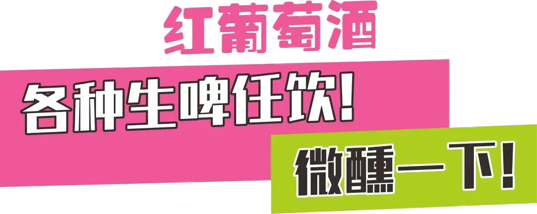 鲜啤扎啤任饮、红酒白葡萄酒任拿