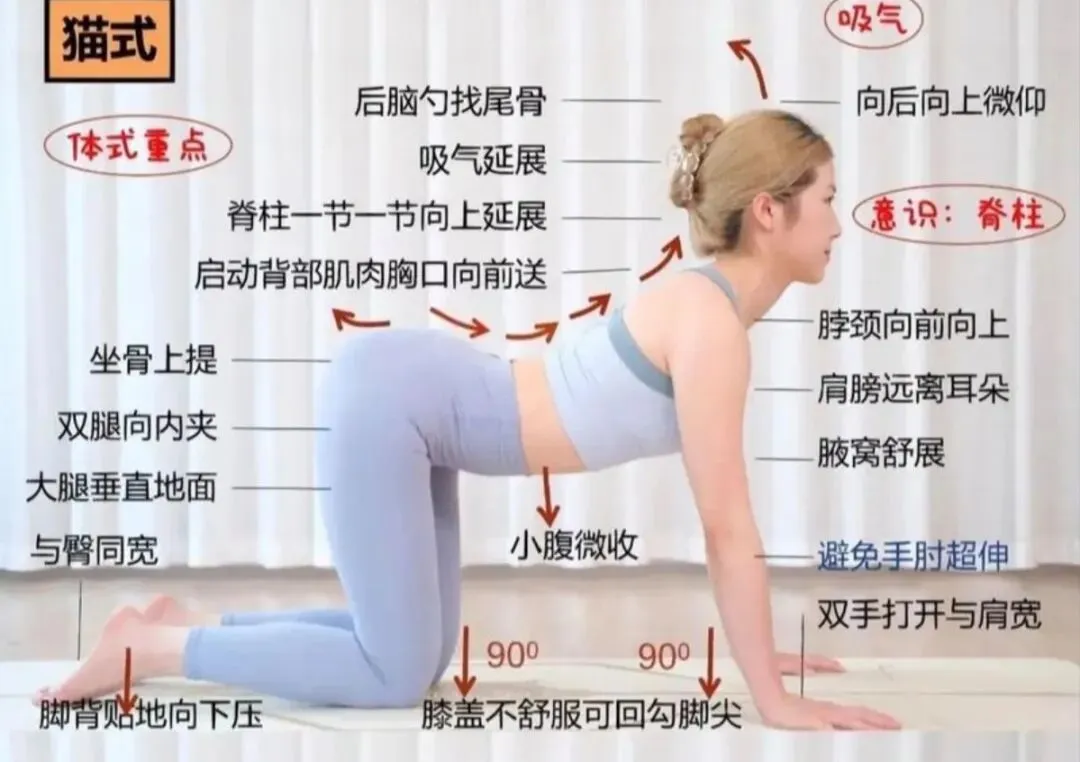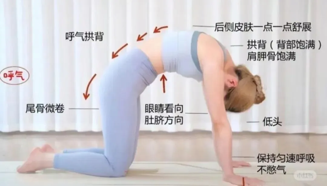 - 呼气:低头、弓背(猫式)