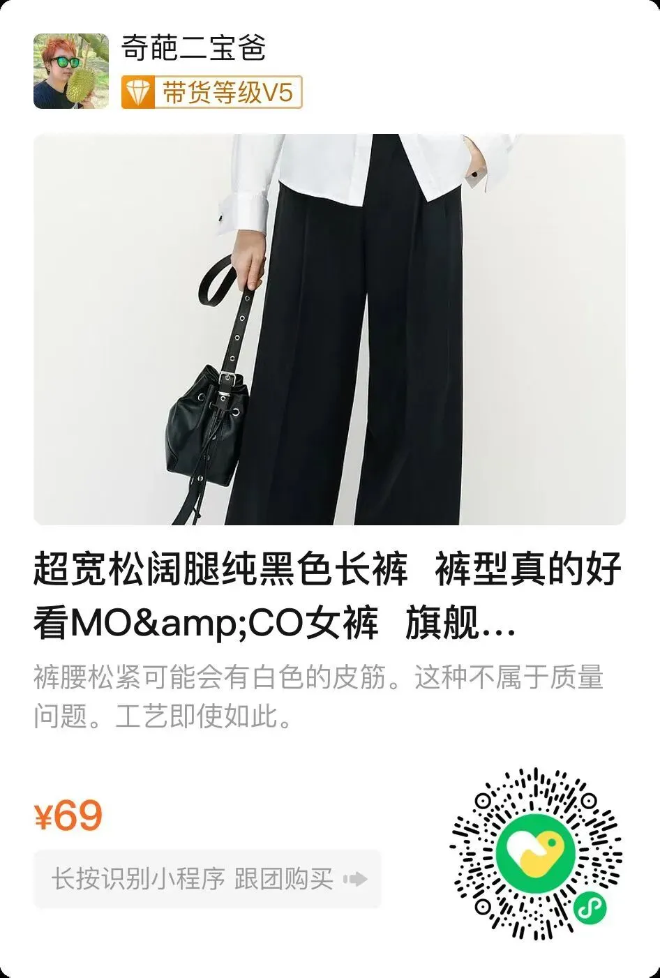 第二款妇女节好物,是我帮腿精二宝妈从工厂挖掘来的,超宽松阔腿纯黑色长裤,裤型真的好看。很多女生都喜欢的MO&CO女裤 ,价格不低,旗舰店1000元。