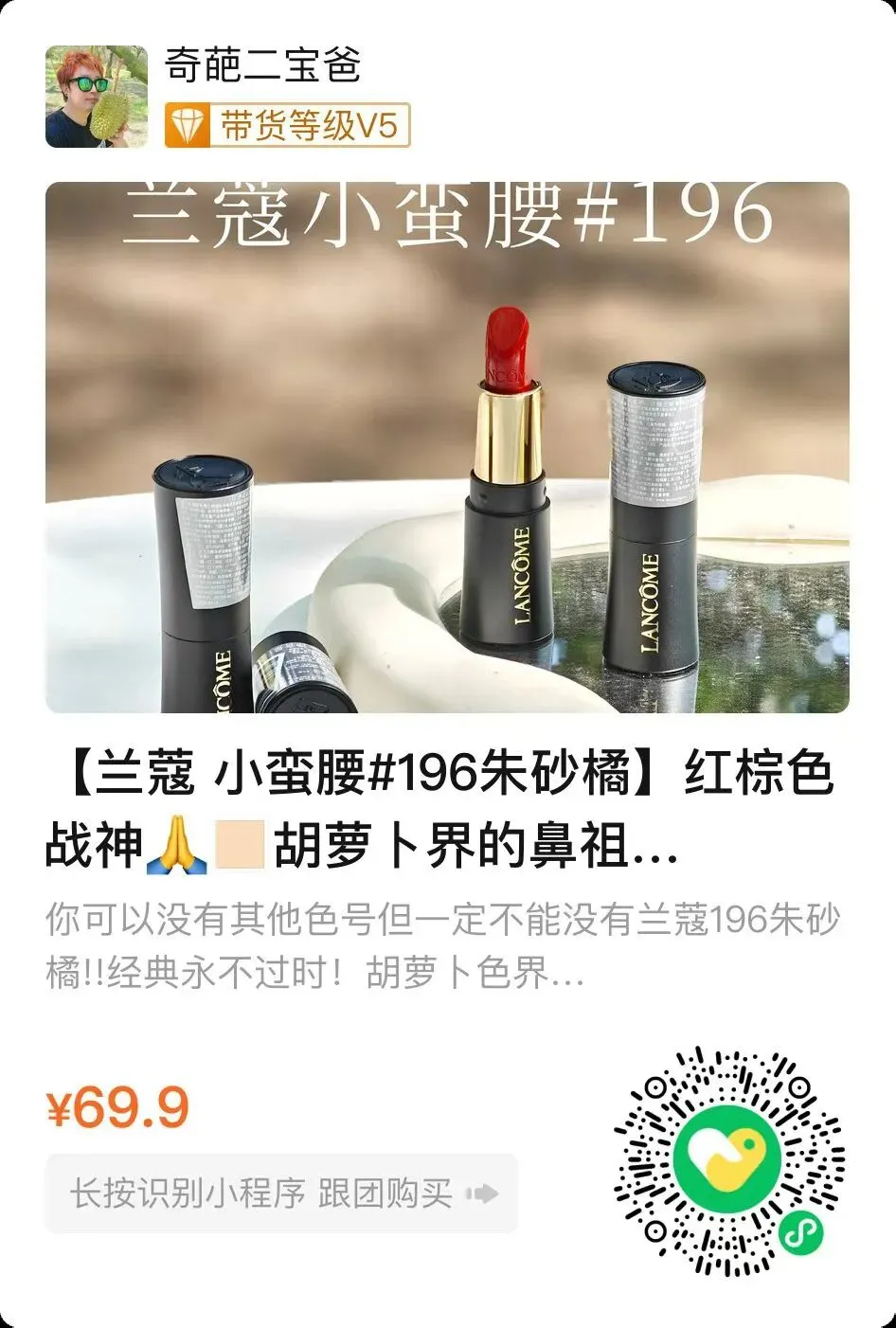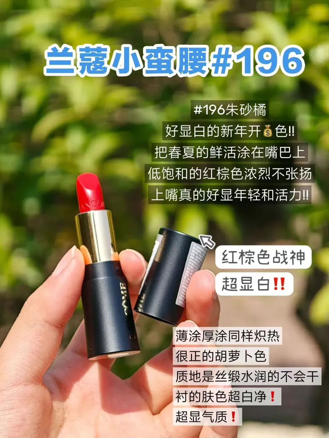 第三款来帮助大家上班提起精气神,兰蔻小蛮腰#196朱砂橘,红棕色战神,胡萝卜界的鼻祖色,好显白的新年开色来啦。