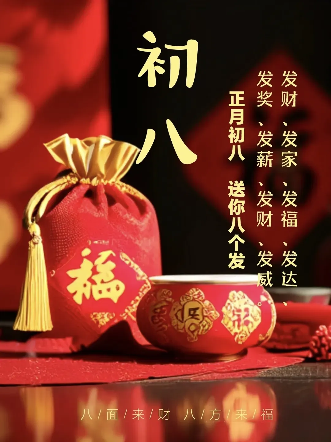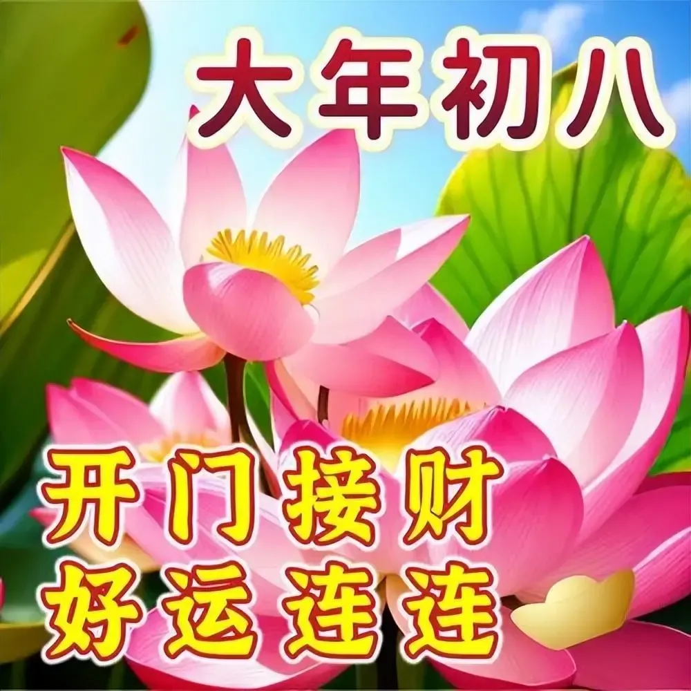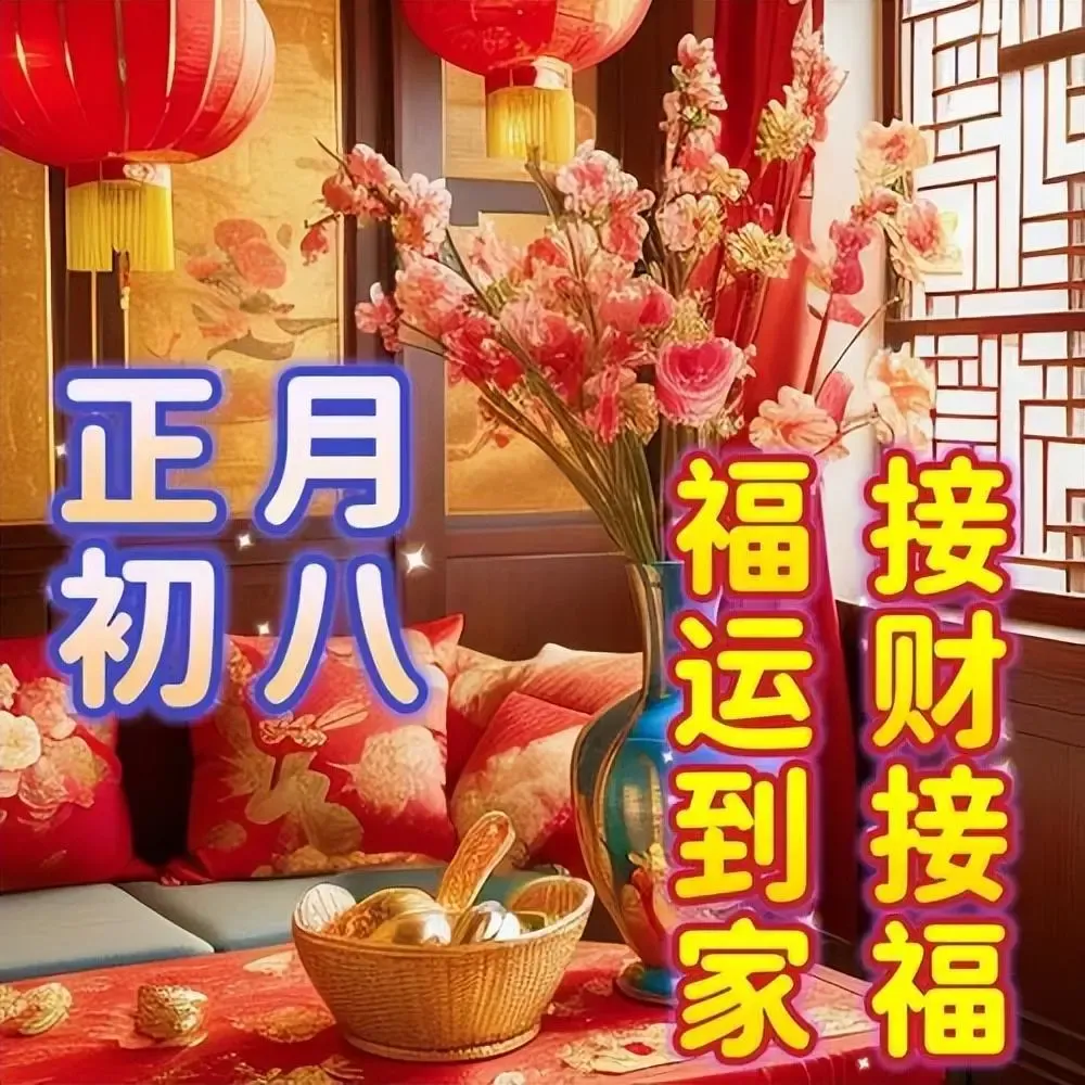 初八清晨送祝福,愿财气伴着暖意入家门,福气随着晨光落心头。愿你口袋满满,心中安然,生活不缺甜,人生不缺顺,一路贵人相助,一路喜事相随,一整年兴旺发达。