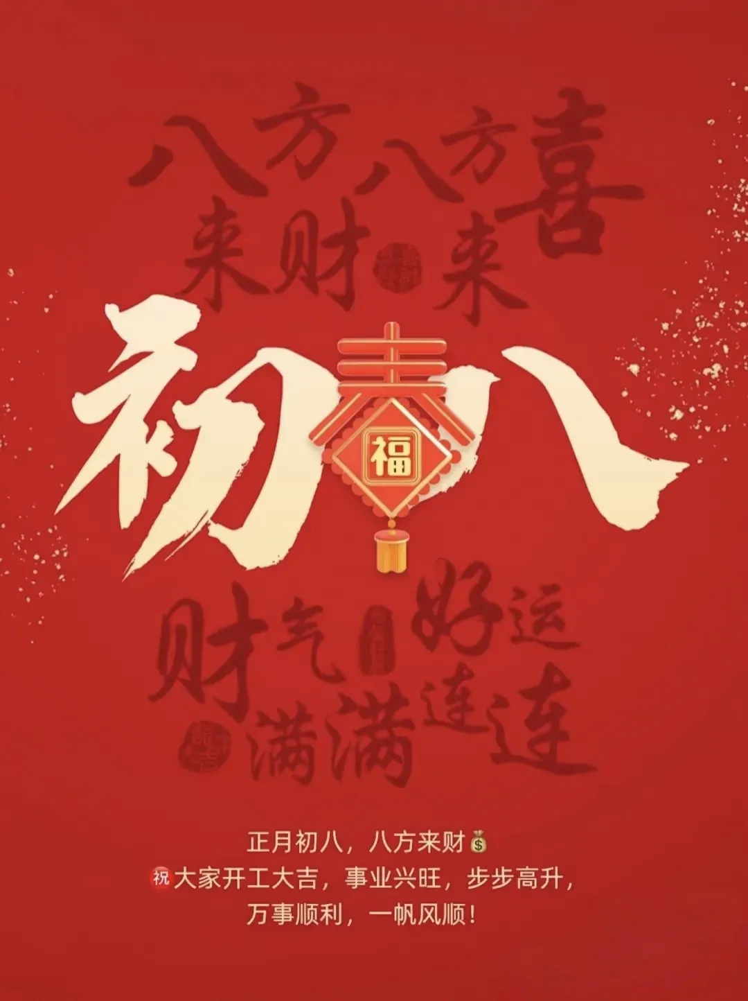 大年初八,发发发。愿你财富越积越多,运气越来越旺,身体越来越棒,心情越来越美。不被生活为难,不被烦恼困扰,赚钱顺手,做事顺心,日子顺心顺意,幸福长长久久。