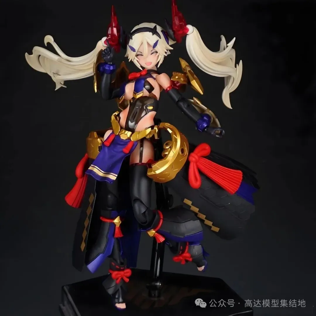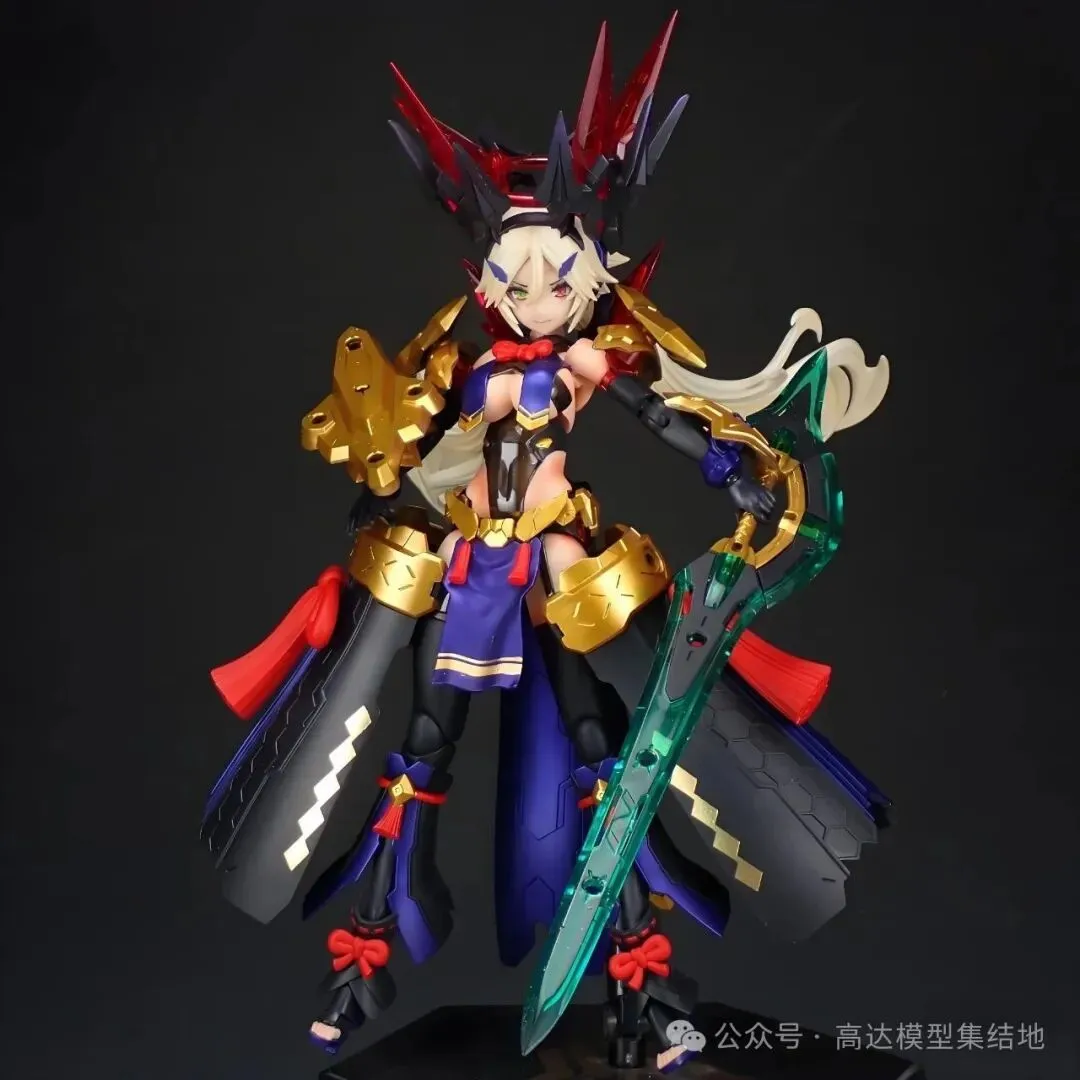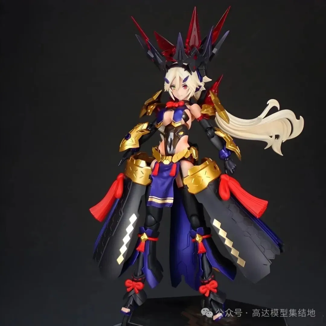 以寿屋HG女神装置「皇巫 素戋呜尊」为基础套件,摒弃了原版中过于纤细的线条,强化了装甲的厚重感与层次感,追加了大量王权专属细节,配色上延续神话中的“风暴色系”,同时融入金纹点缀,既保留了素戋呜尊的清冷战神气质,又新增了王权的威严与华贵,让这台机娘,不再是单纯的“模型摆件”,而是活态的神话战神,是执掌风暴的王权主宰。