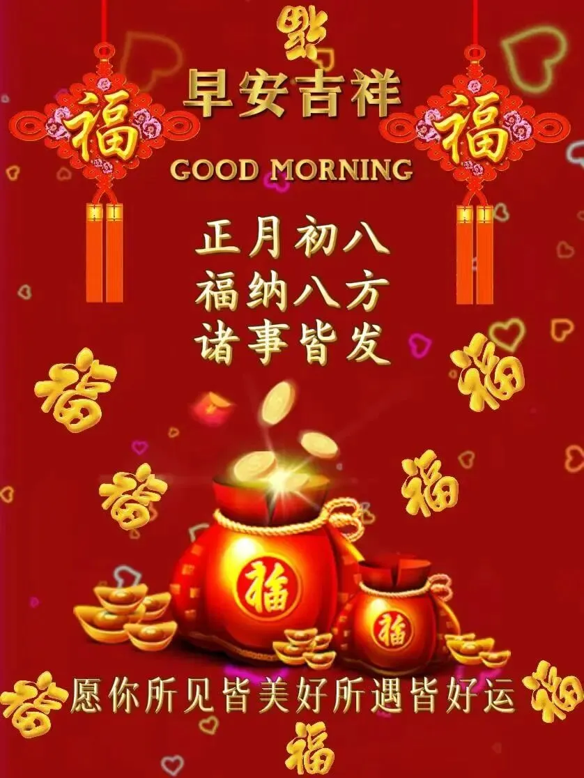 ✨🏮🙏大年初八祝福不能忘,短信送你愿吉祥。祝你:大财小财处处发财,大事小事事事顺利;亲情友情情情如意,官运财运运运亨通;亲人爱人人人安康,马年快乐!