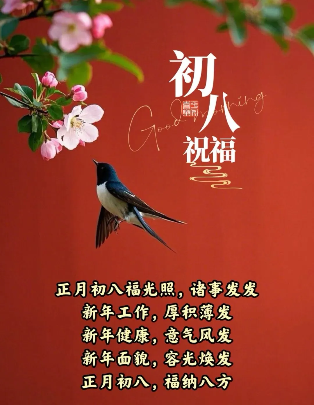 12.正月初八,八面玲珑顺。长假结束是自然的规律,奋斗不息是人生的常态。愿您顺应时令调整步伐,顺应内心追逐梦想,在这个马年里,活出自己想要的模样。