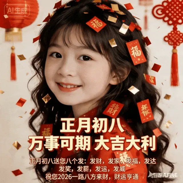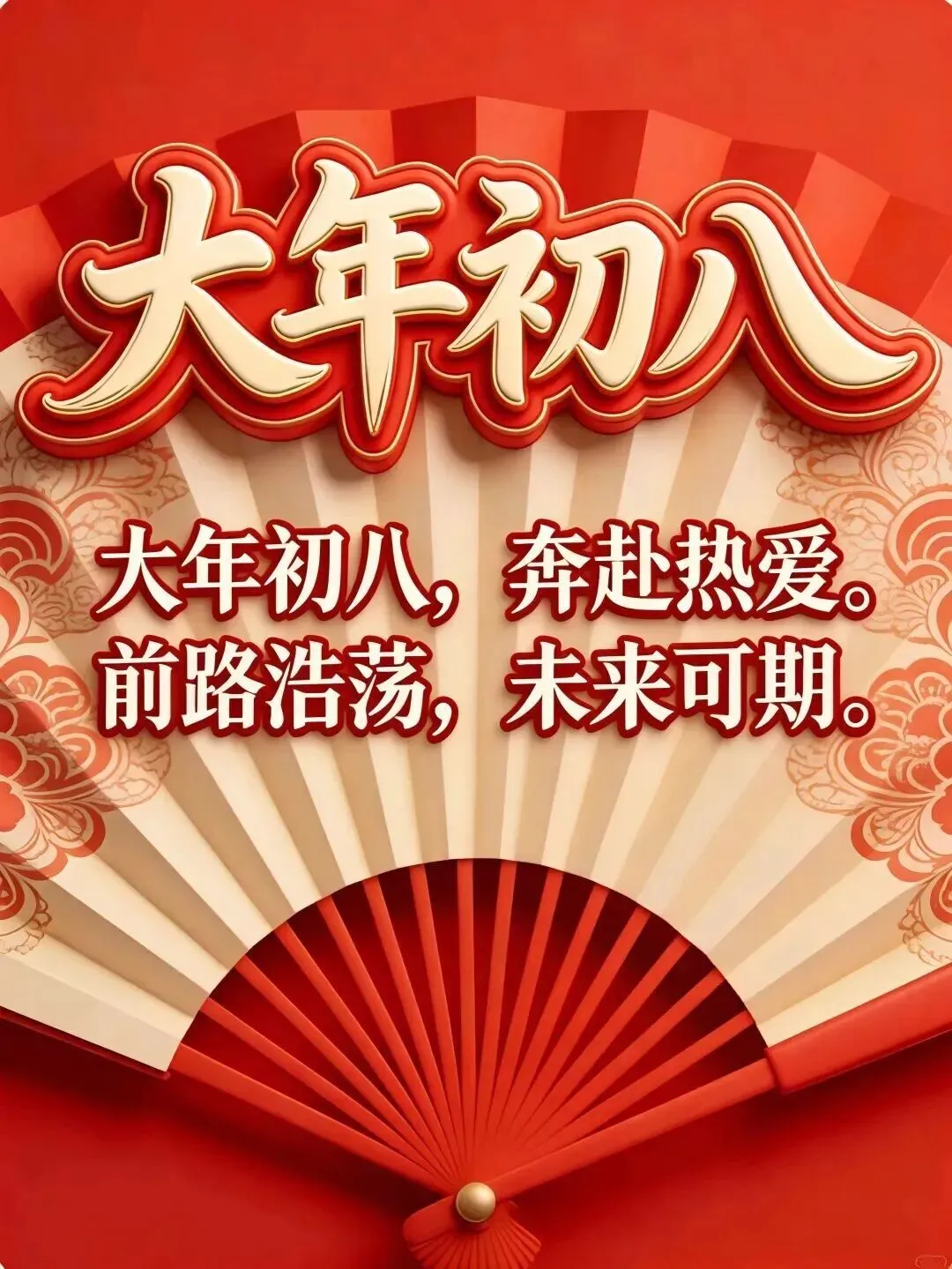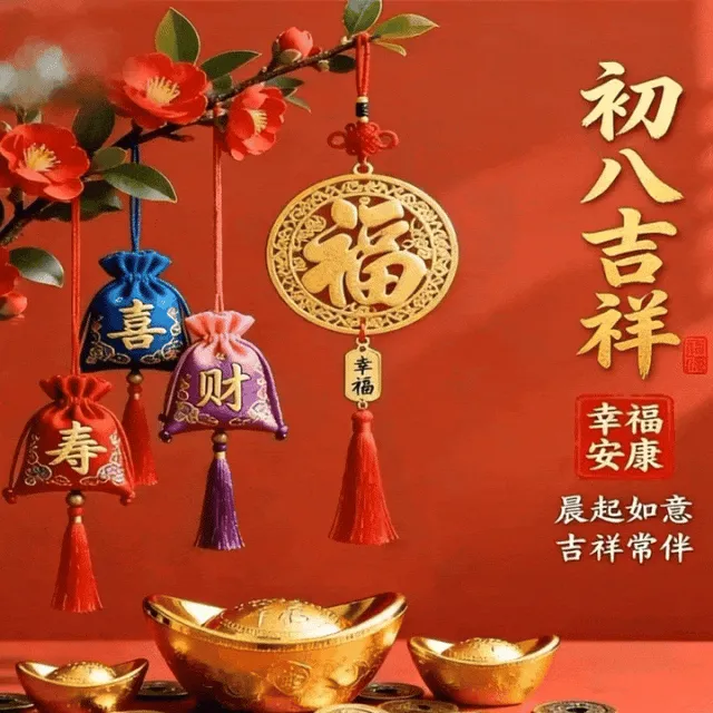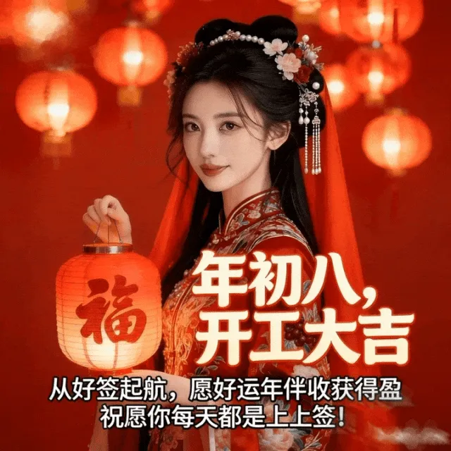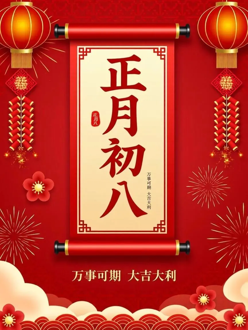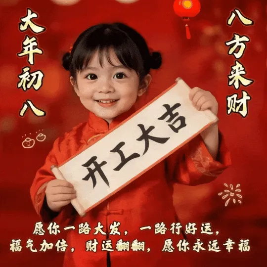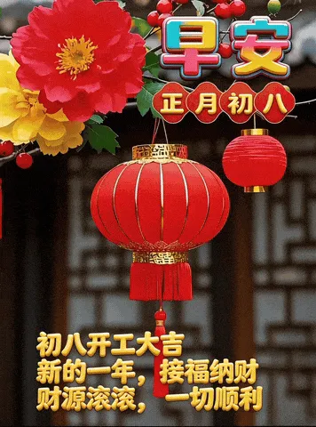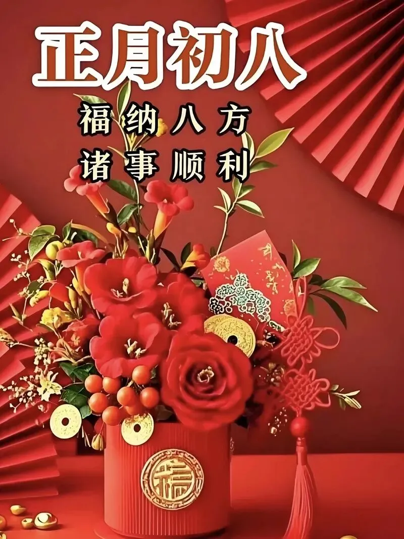 4. 正月初八,八仙赐福!🌸 传说八仙今日下界,为你送来平安、健康、财运与喜乐。愿你新的一年,如铁拐李般豁达,如吕洞宾般洒脱。生意兴隆,客源不断;家人安康,岁岁无忧。早安,开启幸运新模式!🍀🏮👨‍👩‍👧‍👦