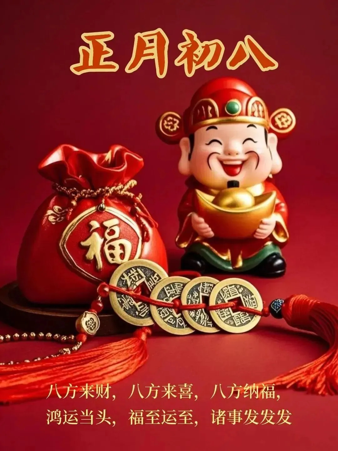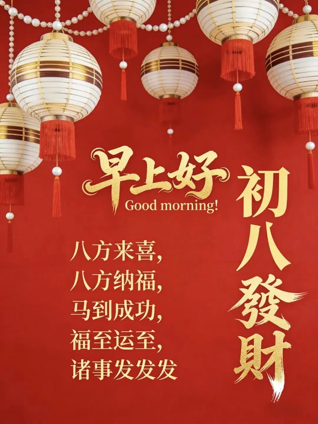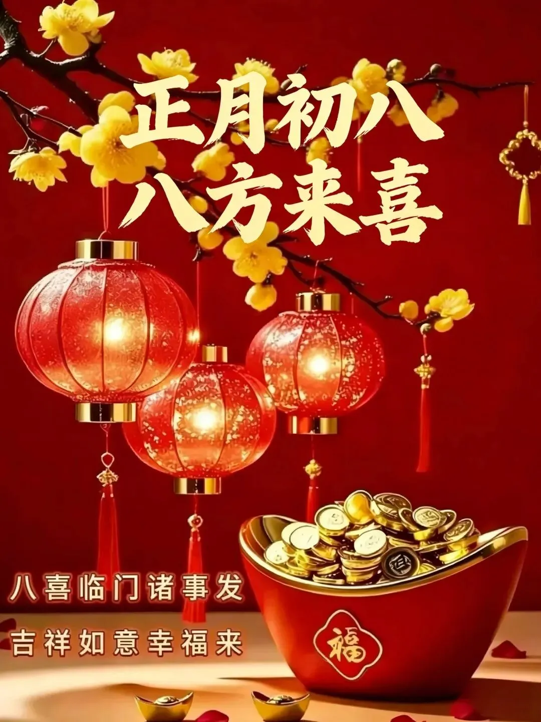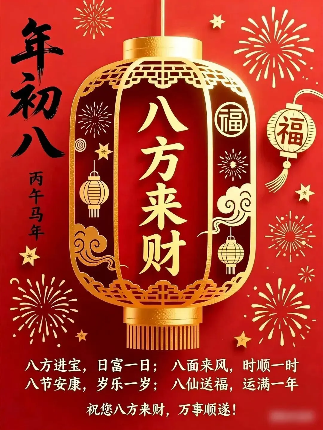 4. 正月初八,八仙赐福!🌸 传说八仙今日下界,为你送来平安、健康、财运与喜乐。愿你新的一年,如铁拐李般豁达,如吕洞宾般洒脱。生意兴隆,客源不断;家人安康,岁岁无忧。早安,开启幸运新模式!🍀🏮👨‍👩‍👧‍👦