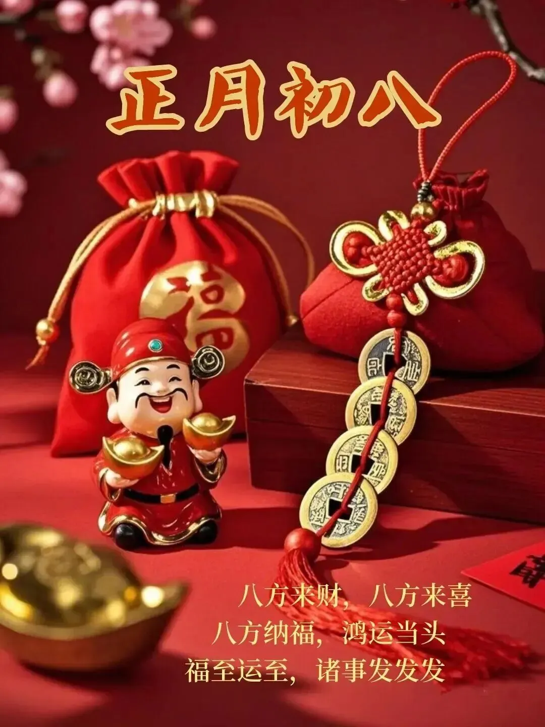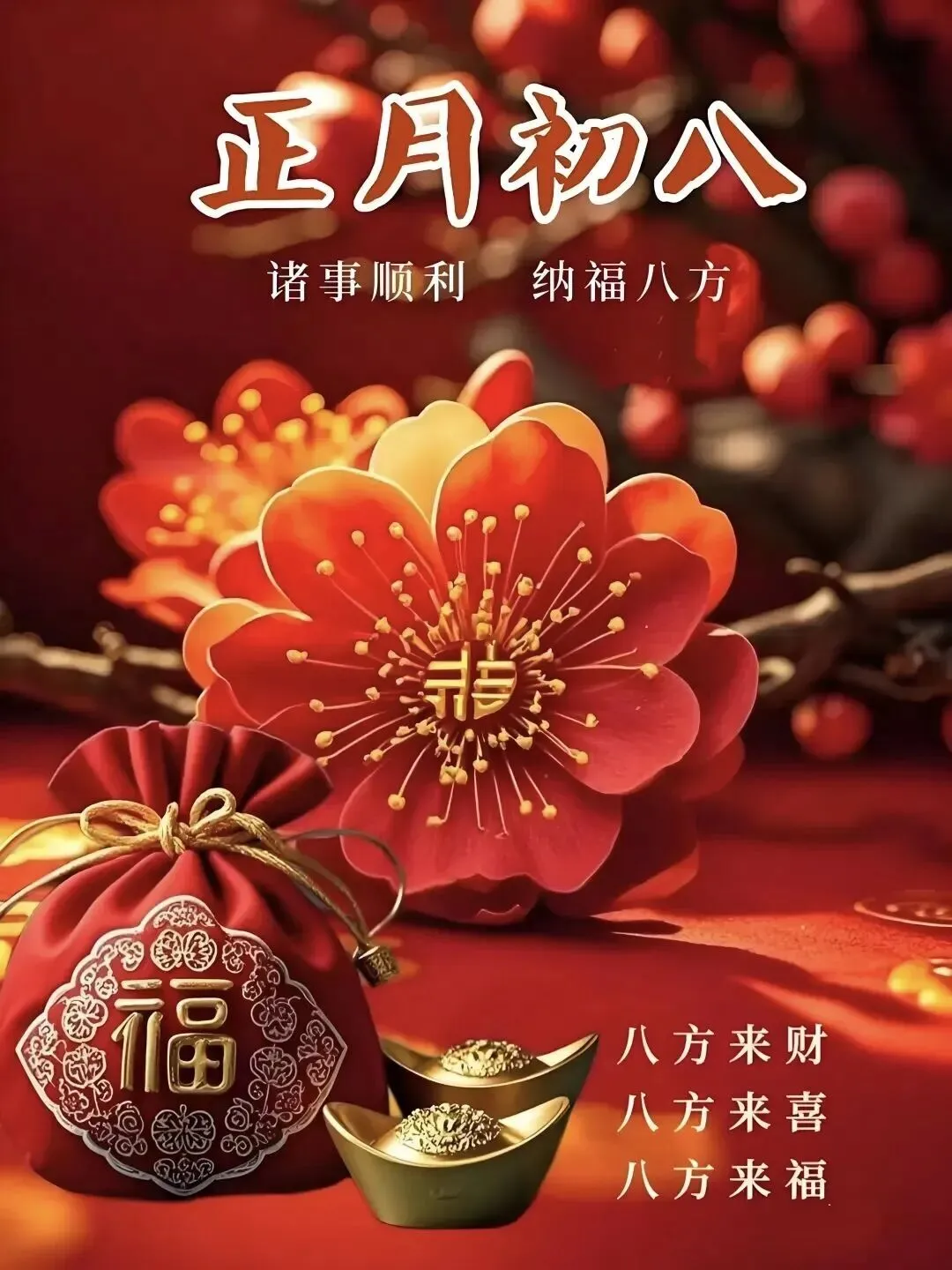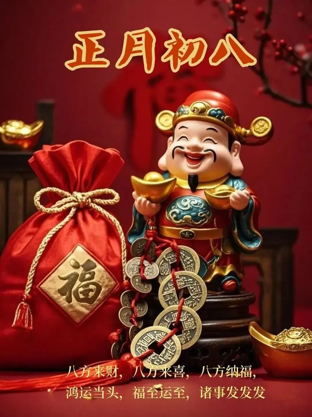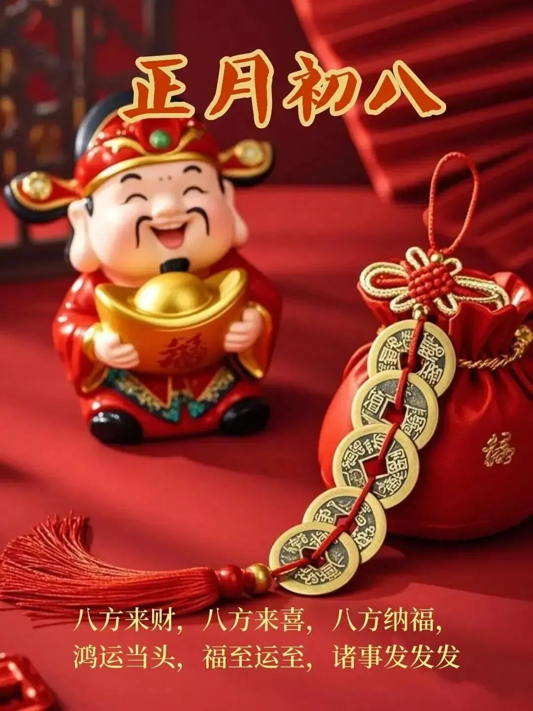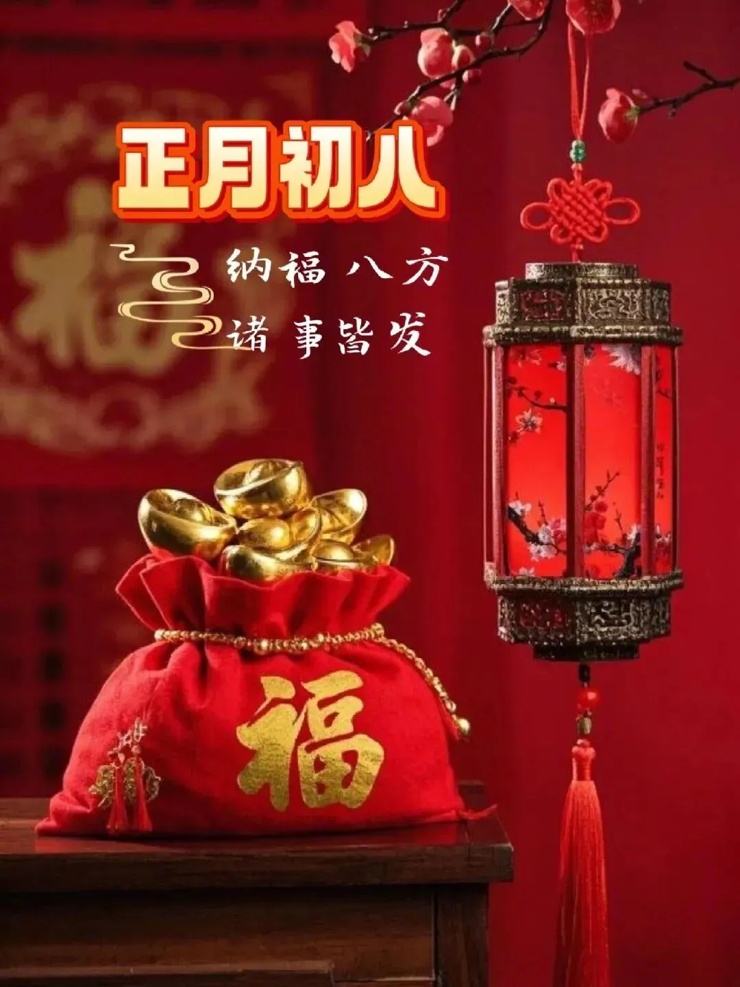 4. 正月初八,八仙赐福!🌸 传说八仙今日下界,为你送来平安、健康、财运与喜乐。愿你新的一年,如铁拐李般豁达,如吕洞宾般洒脱。生意兴隆,客源不断;家人安康,岁岁无忧。早安,开启幸运新模式!🍀🏮👨‍👩‍👧‍👦