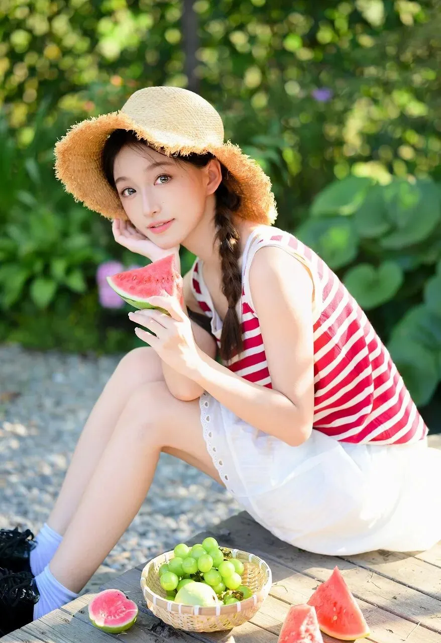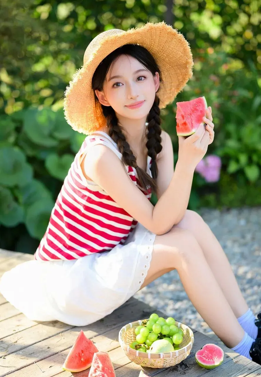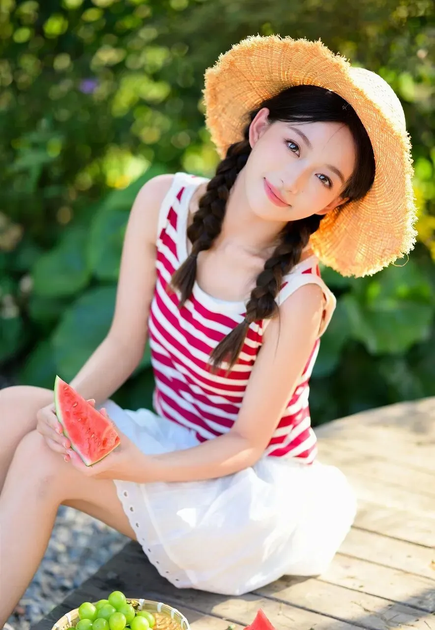夏日,是一首热烈的诗,是一幅绚丽的画,是阳光与绿意交织的梦幻篇章。当炽热的阳光洒在大地上,绿荫成了人们避暑的天堂,而西瓜,则是夏日里最清甜的慰藉。在这如诗如画的夏日里,一位头戴草帽、手持西瓜的少女,如同清新的微风,带来了满满的清凉与惬意。她坐在木质平台上,身后是一片郁郁葱葱的绿植,阳光透过叶子的缝隙洒下,形成一片片斑驳的光影。少女头戴一顶宽边的浅棕色草帽,草帽的毛边自然卷曲,透着一种随性与自然的气息。她的头发编成了两条俏皮的辫子,垂落在肩膀两侧,显得格外清纯可爱。她上身穿着一件红白相间的条纹背心,鲜艳的红色与纯净的白色相互映衬,充满了夏日的活力与热情。下身搭配一条白色的短裙,裙摆处精致的花边设计,增添了几分甜美与温柔。她的双腿白皙修长,自然地并拢着,姿态优雅而放松。此刻,她双手各持一块鲜红的西瓜,西瓜的果肉饱满多汁,在阳光的照耀下,闪烁着诱人的光泽。她将一块西瓜微微递出,脸上洋溢着灿烂的笑容,那笑容如同春日的暖阳,温暖而明亮,又似夏日的清风,轻柔而惬意。她的眼神明亮而灵动,仿佛藏着星辰大海,又透露出对这夏日清甜的满足与欢喜。