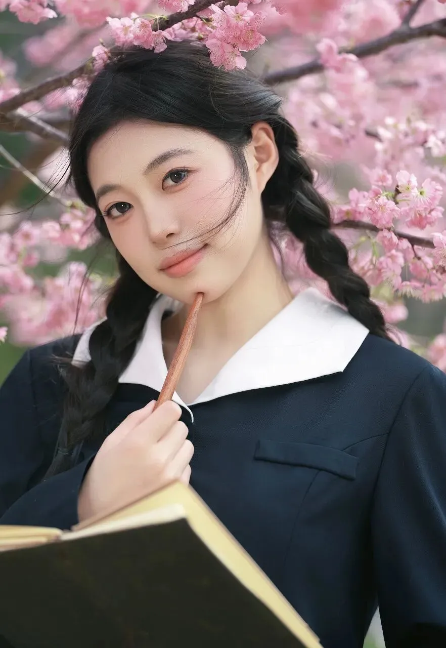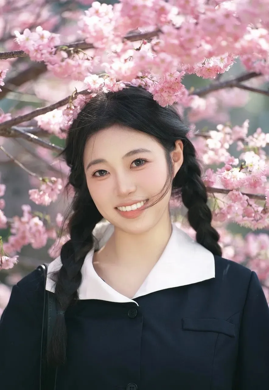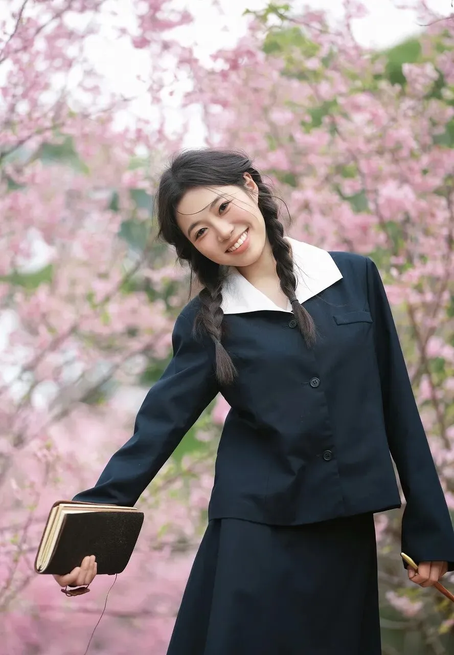 春,是一首轻柔的诗,是一幅绚丽的画,是一场盛大的花之盛宴。当春风轻拂,粉色的樱花如梦幻的云霞般缀满枝头,整个世界都沉浸在一片浪漫的氛围中。在这如梦如幻的樱花雨里,一位身着深色制服的少女宛如春日里最灵动的音符,奏响了一曲青春与自然的美妙乐章。她站在樱花树下,一头乌黑的长发编成两条俏皮的辫子,垂落在肩头。几缕发丝被微风轻轻撩起,拂过她白皙的脸庞,更添几分柔美。她的眼眸明亮而清澈,如同春日里的湖水,倒映着满树的繁花,闪烁着灵动的光芒。嘴角微微上扬,露出一抹灿烂的笑容,那笑容如同春日的暖阳,温暖而明亮,能驱散世间所有的阴霾。她身着一件深蓝色的制服外套,白色的衬衫领口整齐地翻在外面,简约而大方。深色的制服与粉嫩的樱花形成鲜明的对比,更突显了她的青春活力。她的右手轻轻抬起,拈起一枝樱花,仿佛在与花儿进行一场无声的对话。那姿态,优雅而自然,仿佛她本就是这樱花树的一部分,与这春日的美景融为一体。樱花,是春日的精灵,是浪漫的象征。它们在枝头肆意绽放,一团团、一簇簇,粉得娇艳,粉得迷人。