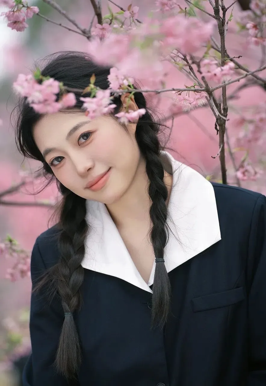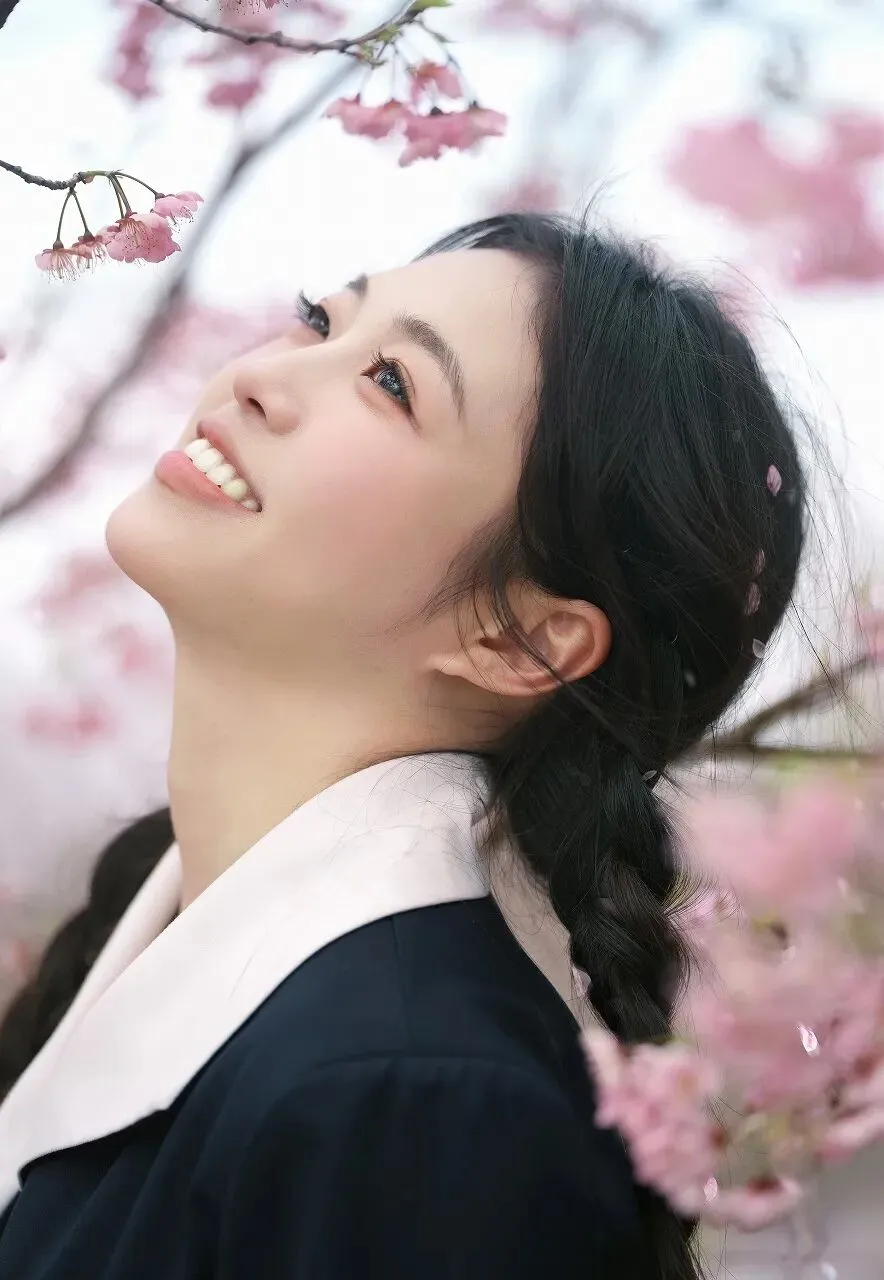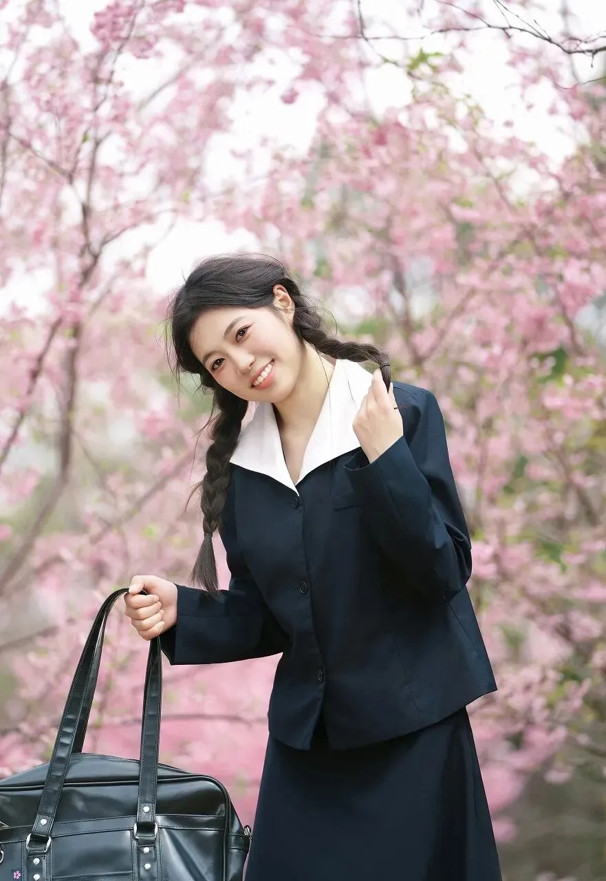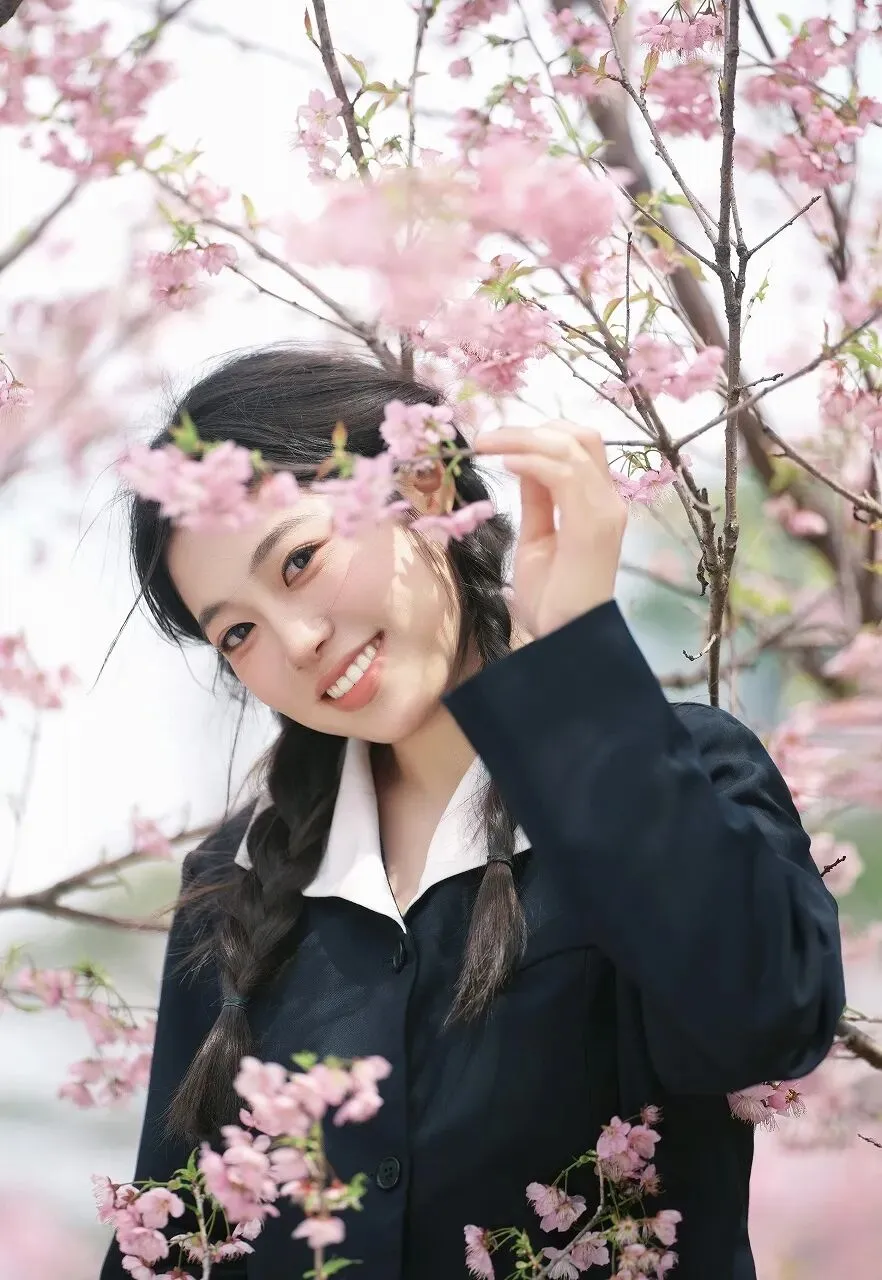 春,是一首轻柔的诗,是一幅绚丽的画,是一场盛大的花之盛宴。当春风轻拂,粉色的樱花如梦幻的云霞般缀满枝头,整个世界都沉浸在一片浪漫的氛围中。在这如梦如幻的樱花雨里,一位身着深色制服的少女宛如春日里最灵动的音符,奏响了一曲青春与自然的美妙乐章。她站在樱花树下,一头乌黑的长发编成两条俏皮的辫子,垂落在肩头。几缕发丝被微风轻轻撩起,拂过她白皙的脸庞,更添几分柔美。她的眼眸明亮而清澈,如同春日里的湖水,倒映着满树的繁花,闪烁着灵动的光芒。嘴角微微上扬,露出一抹灿烂的笑容,那笑容如同春日的暖阳,温暖而明亮,能驱散世间所有的阴霾。她身着一件深蓝色的制服外套,白色的衬衫领口整齐地翻在外面,简约而大方。深色的制服与粉嫩的樱花形成鲜明的对比,更突显了她的青春活力。她的右手轻轻抬起,拈起一枝樱花,仿佛在与花儿进行一场无声的对话。那姿态,优雅而自然,仿佛她本就是这樱花树的一部分,与这春日的美景融为一体。樱花,是春日的精灵,是浪漫的象征。它们在枝头肆意绽放,一团团、一簇簇,粉得娇艳,粉得迷人。