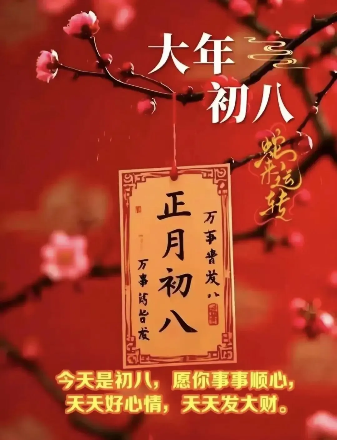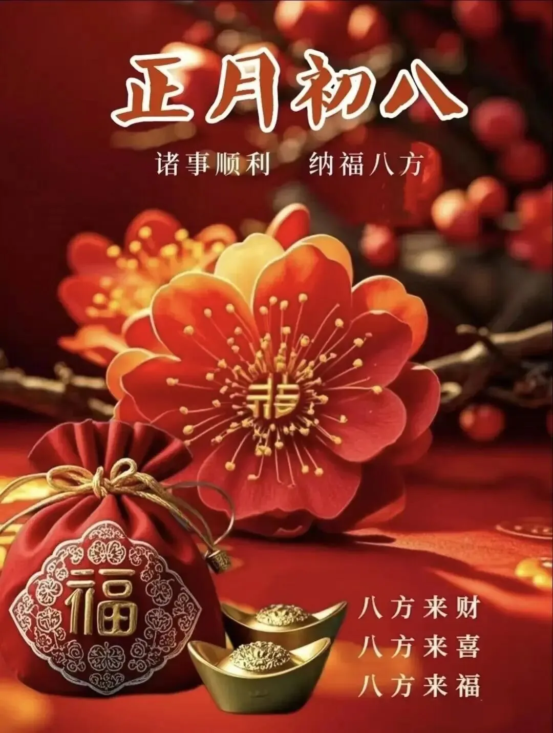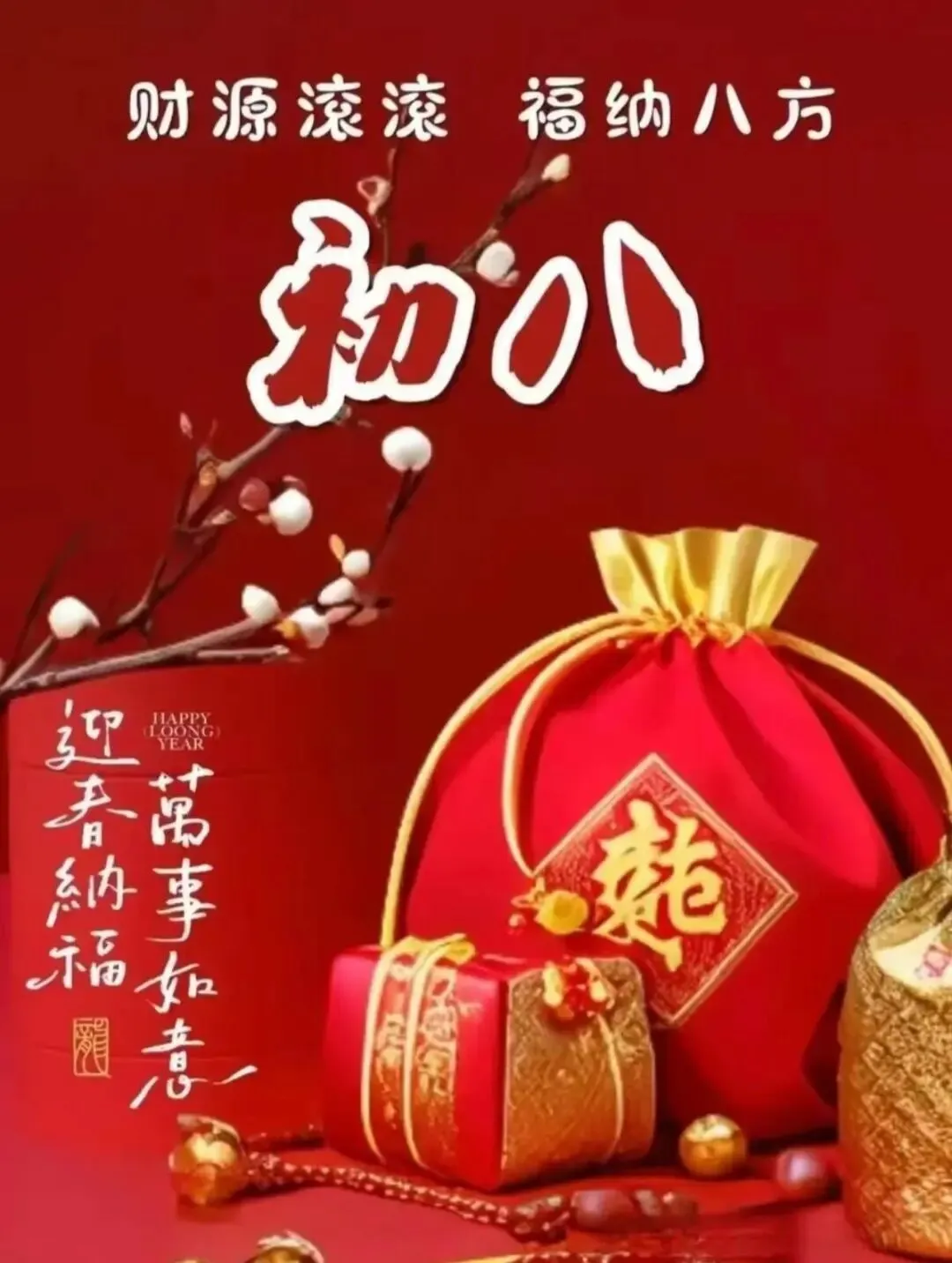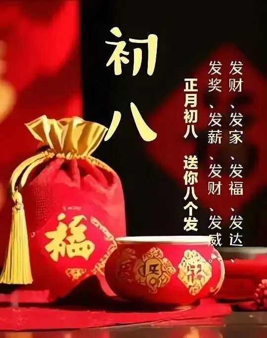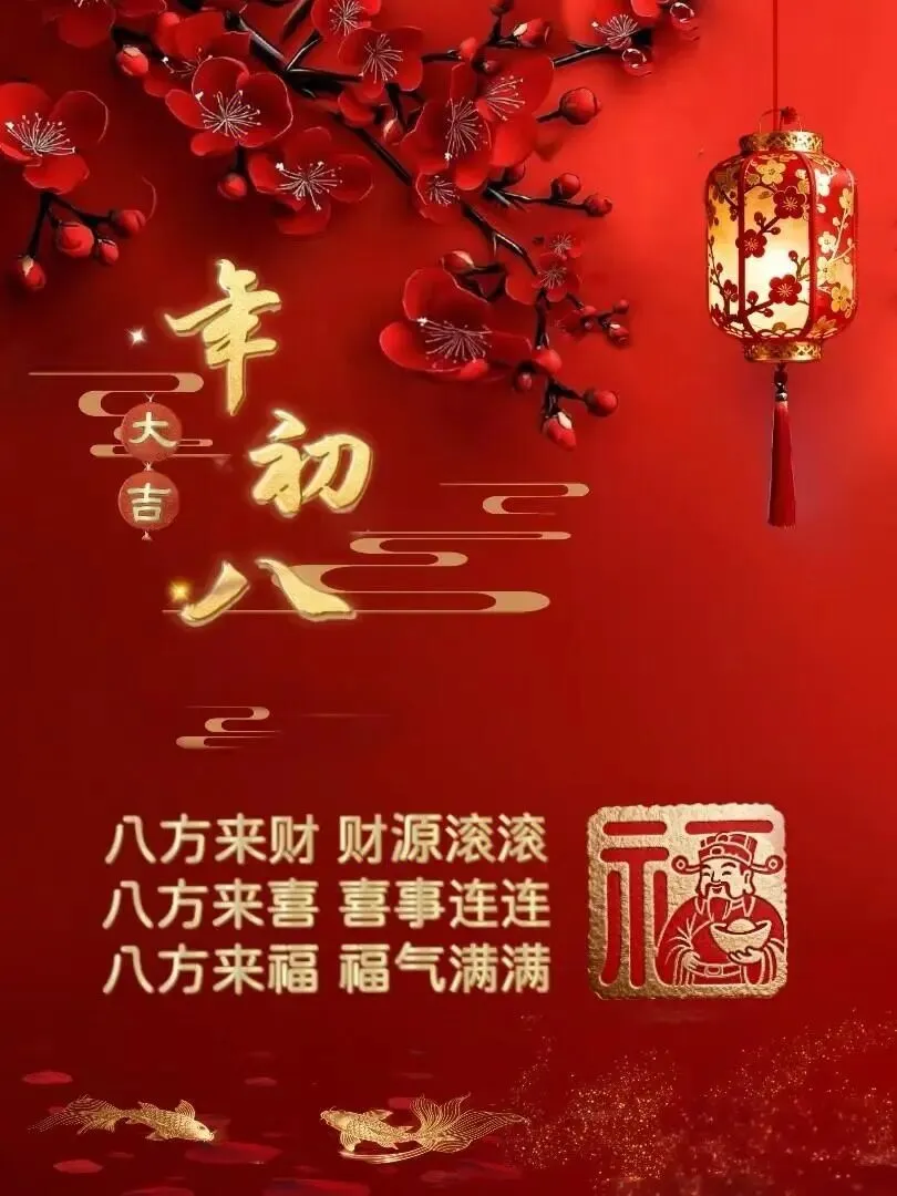 8. 大年初八 福气绕 🍀 财神对你哈哈笑 😆 愿你左手抓金 👐 右手抱银 💰 前程似锦 光芒万丈 ✨ 人生一路凯歌 高唱 🎤 出门遇喜 🌸 在家遇暖 🔥 健康常在 💪 平安长伴 🍎 一年更比一年好 📈