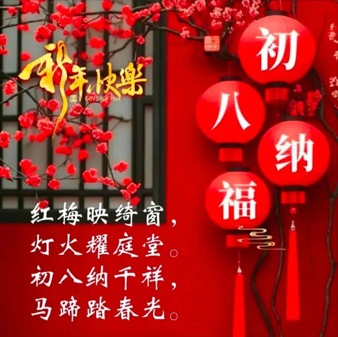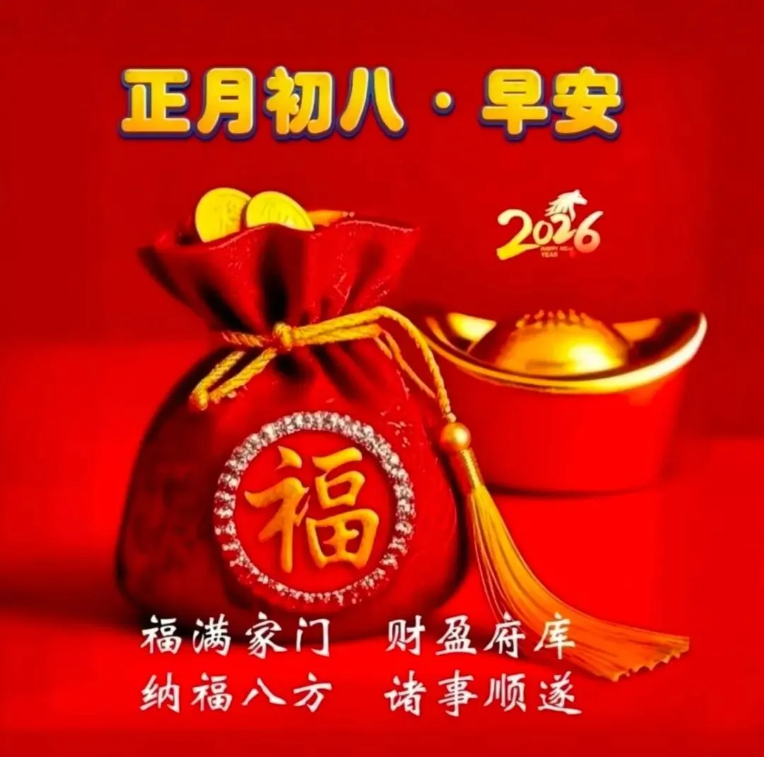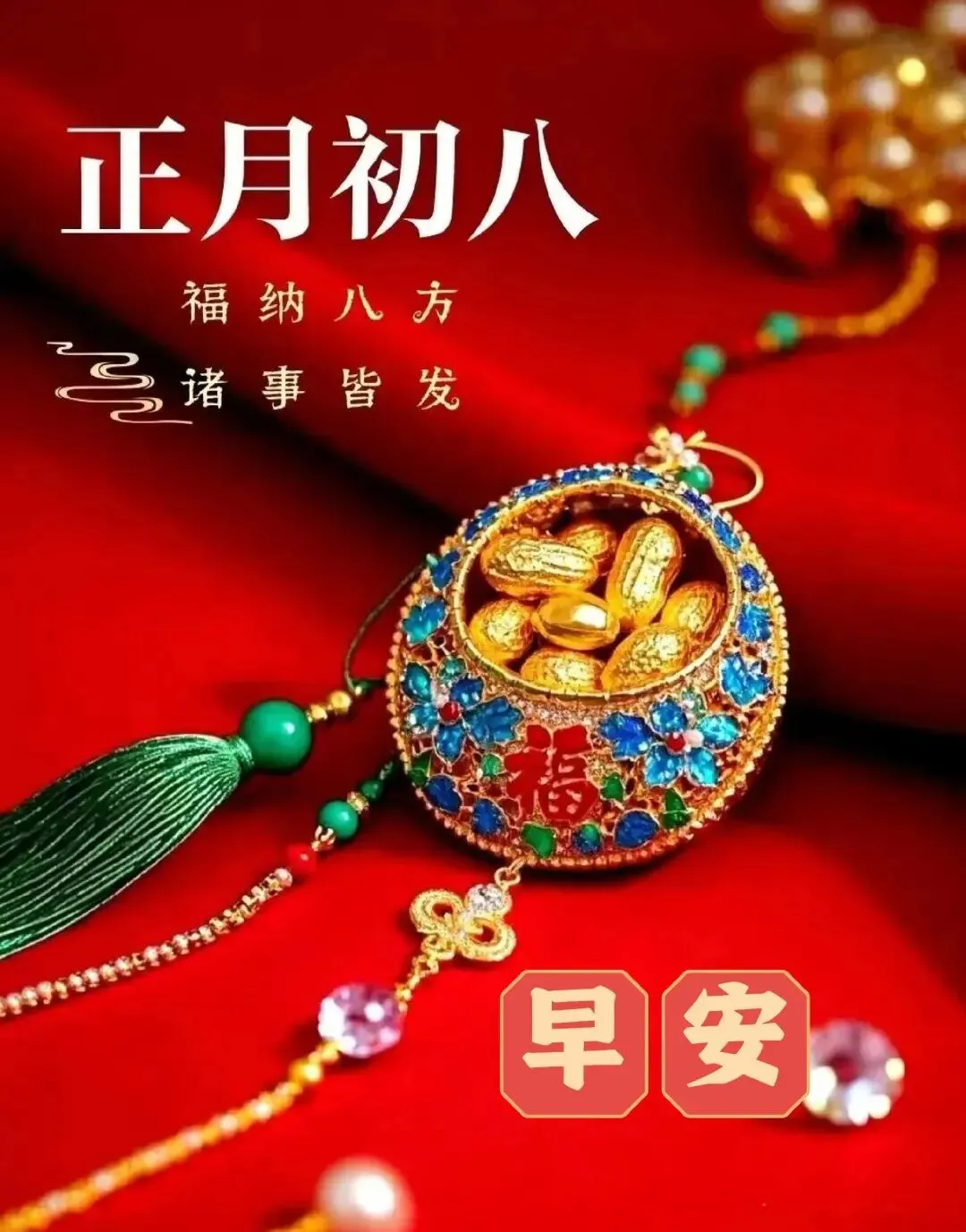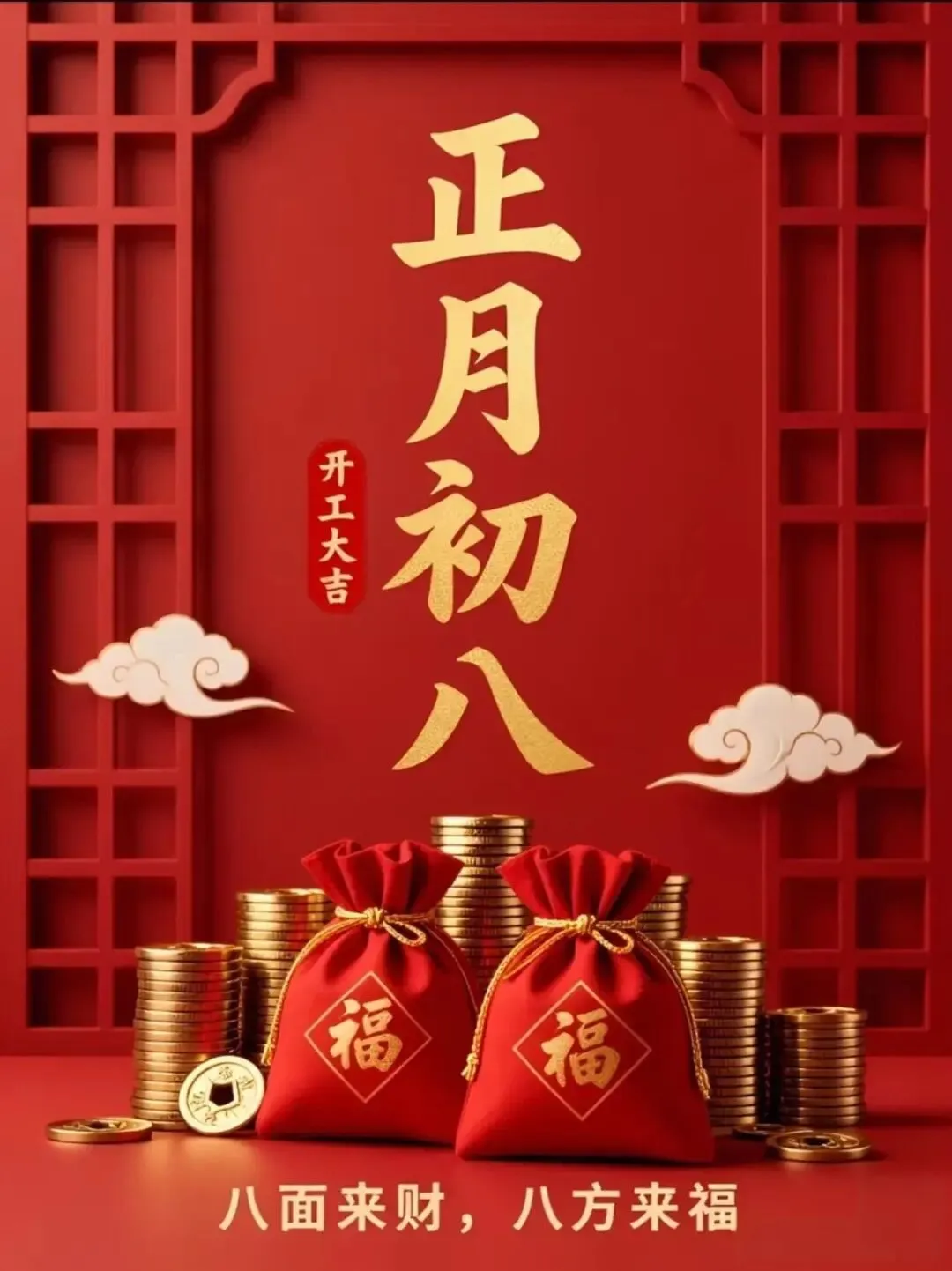 8. 大年初八 福气绕 🍀 财神对你哈哈笑 😆 愿你左手抓金 👐 右手抱银 💰 前程似锦 光芒万丈 ✨ 人生一路凯歌 高唱 🎤 出门遇喜 🌸 在家遇暖 🔥 健康常在 💪 平安长伴 🍎 一年更比一年好 📈