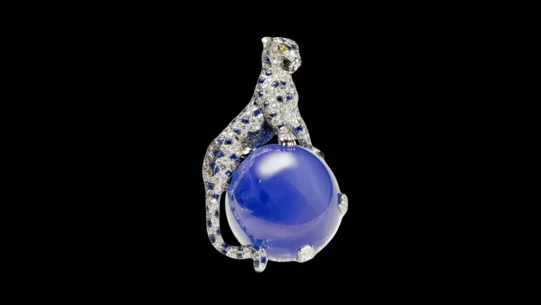 旺财觉得这应该算温莎公爵夫人藏品中出镜率最高的单品之一,这枚由卡地亚于1949年打造的奢华Panthère胸针,“豹豹”屁股下面坐着一颗152克拉的克什米尔蓝宝石。
