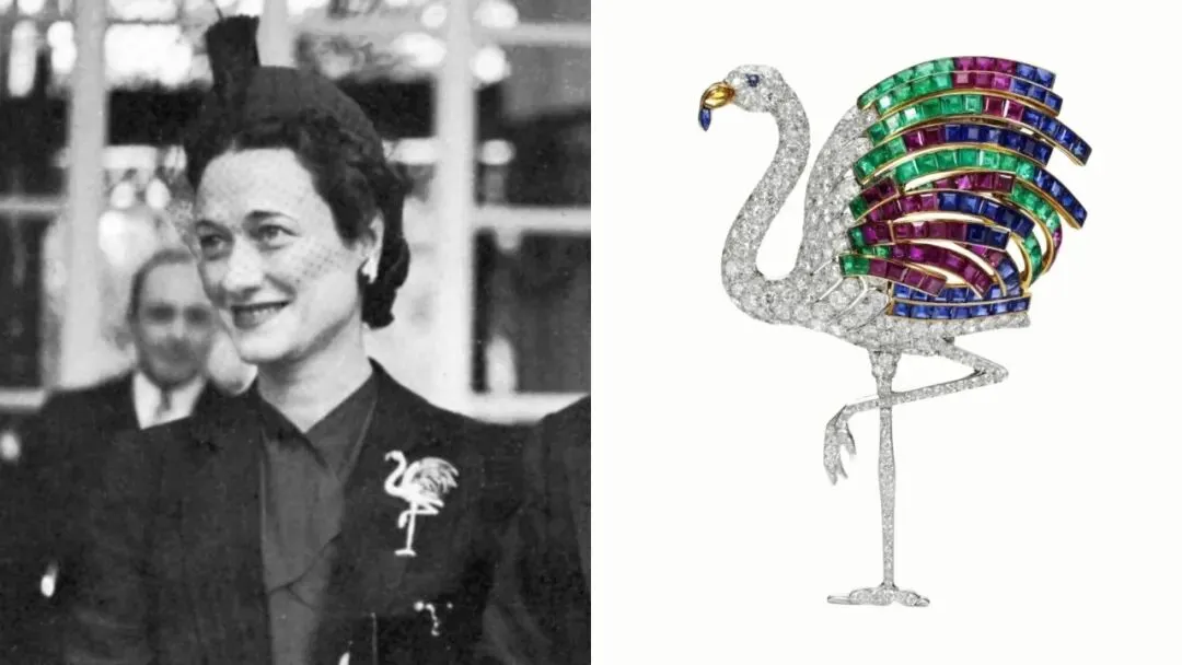 在温莎所拥有的最著名的珠宝中,The Flamant Rose胸针占据着特殊的地位。这款精美的珠宝由卡地亚于1940年制作而成,是温莎公爵为其妻子定制的,彰显了他们对精致、独特珠宝的共同热爱。这件胸针由黄金打造,镶嵌着璀璨的宝石,描绘了一只栩栩如生的火烈鸟,其身体装饰着钻石、红宝石、蓝宝石和祖母绿,而它的喙则由精巧的黑曜石打造。