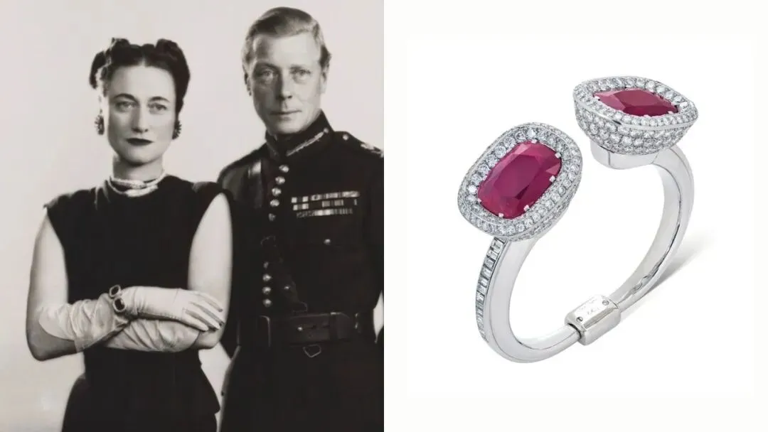 这枚红宝石与钻石手镯是爱德华八世于1936年3月赠予温莎的。手镯上镶嵌着四十颗红宝石,这一非凡的饰品不仅体现了国王对珠宝的热爱,也展现了他对温莎无条件的爱。更令人感到亲切的是,这件珠宝还有一个独特的细节:上面有爱德华亲笔书写的铭文,证明了他与温莎之间深厚的感情。