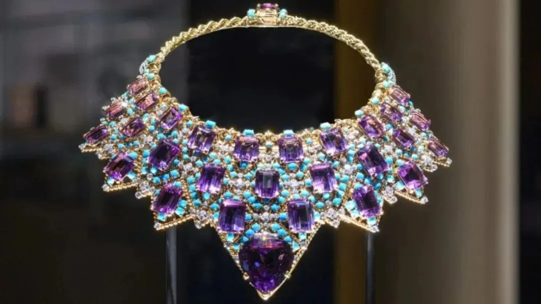 1947年,卡地亚为温莎公爵夫人打造了这条令人印象深刻的雕塑风格项链,镶嵌着绿松石、钻石和紫水晶。