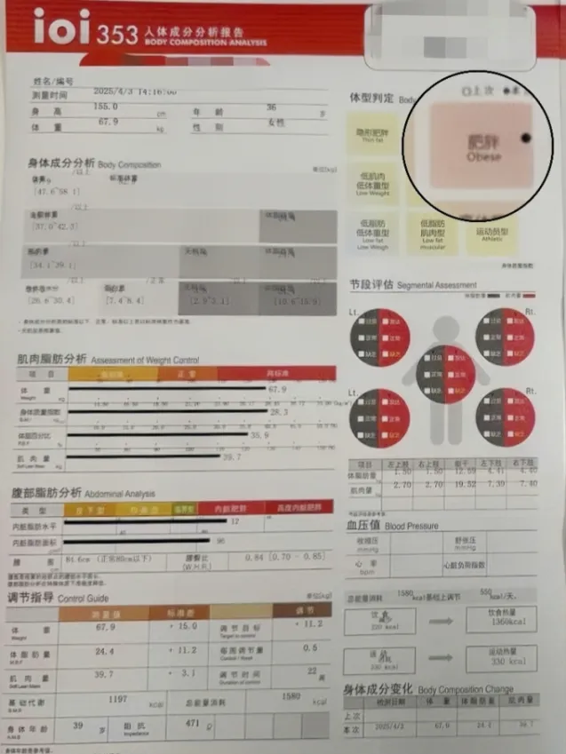 结果一出,我整个人都愣住了——体脂率 35.9%(体重 67.9kg,身高 155cm),胆固醇、血糖统统超标,还有脂肪肝!