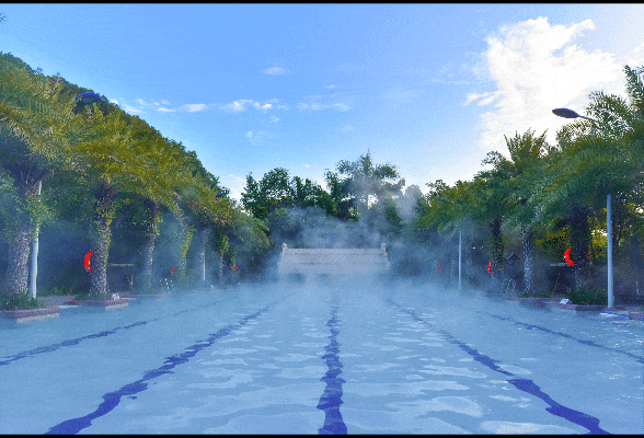 沿山而建的泡池郁郁葱葱,林木遮掩...