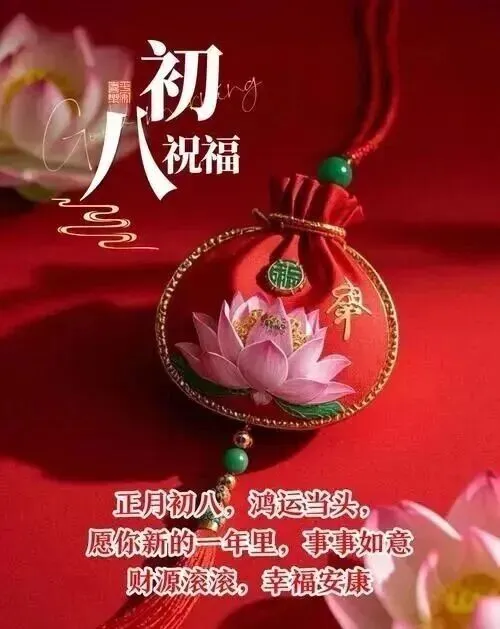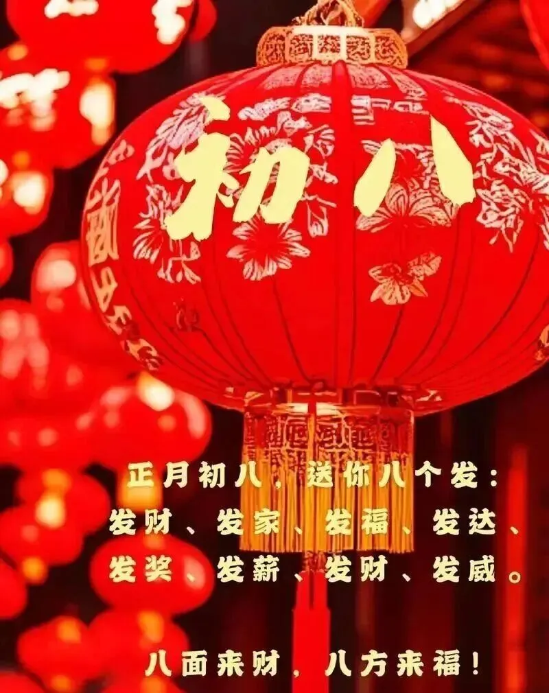16.正月初八,诸事皆发,财源滚滚,福纳八方,身体健康,所遇皆欢喜,所得皆吉祥,顺风顺水顺财神!