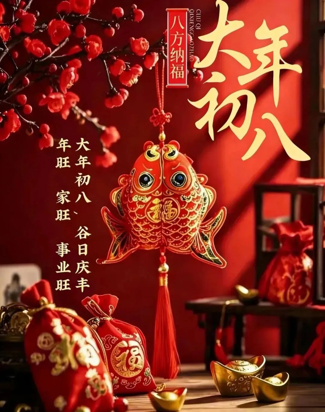 2.初八至,福气到,八方财气汇聚你家。愿你新的一年财源广进,金银满仓,幸福常伴!