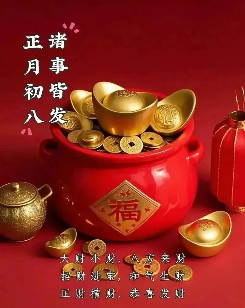 5.正月初八,发财日到。愿你八方来财,招财进宝,财源广进,生活富足,万事顺遂