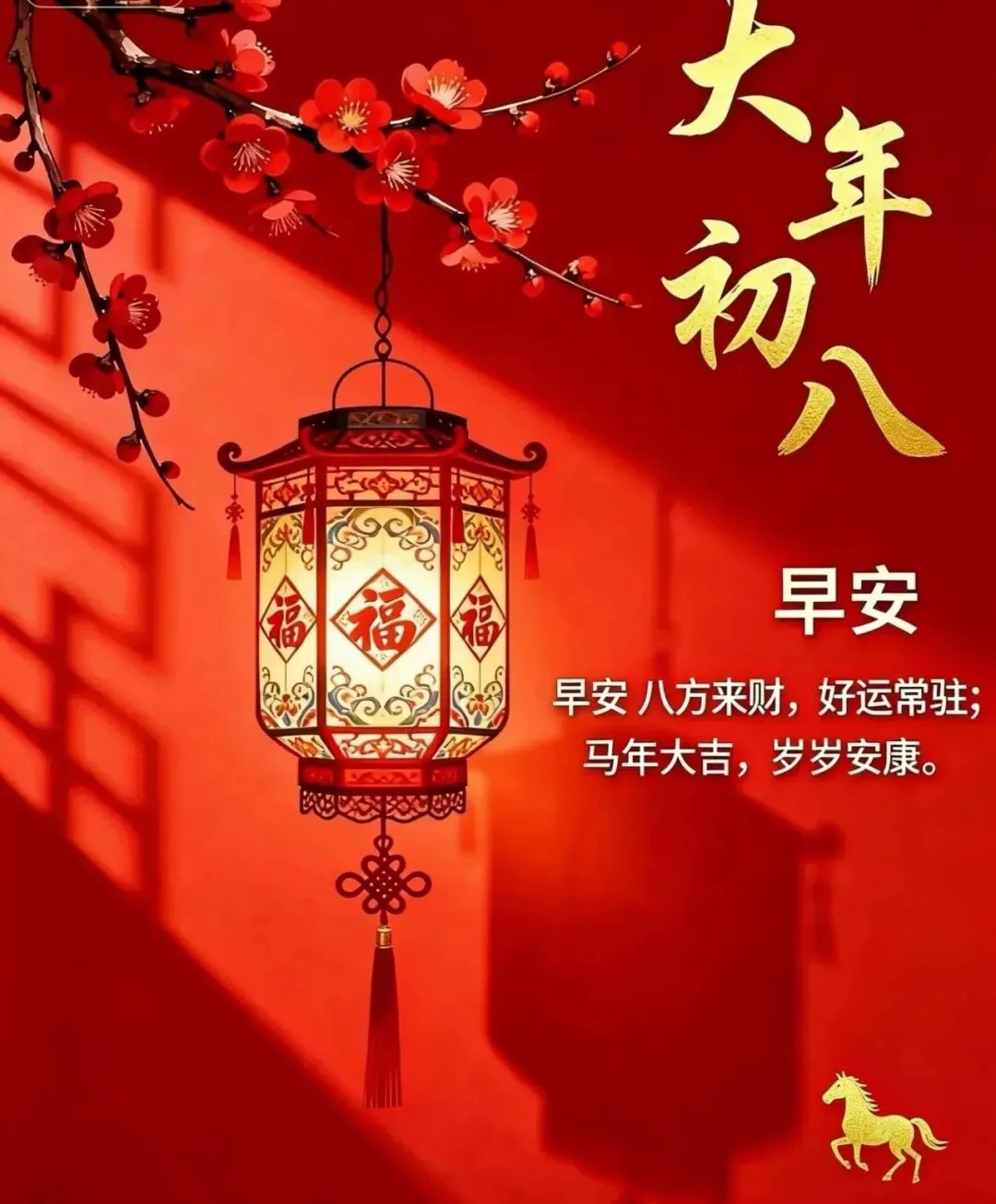 7.大年初八发财日,定能让你发一发,祝你2026马年大吉,万事如意,时时红火,分分兴旺,秒秒兴隆!岁月静好,生活安逸,人间皆安!初八吉祥!