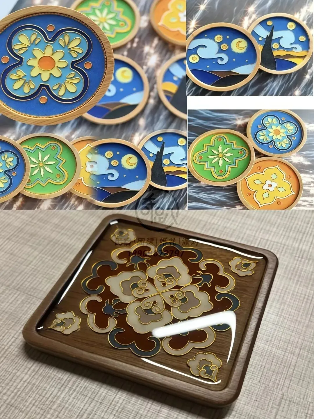 材料:木质杯垫基底、珐琅釉料、金属丝、专用胶、固化剂等