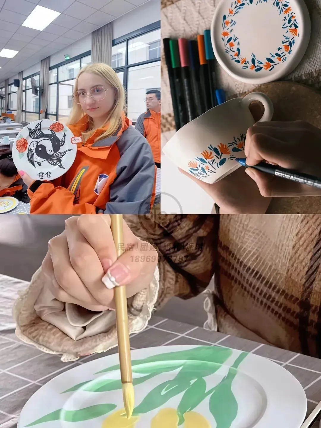 材料:陶瓷素坯(盘/杯等)、陶瓷颜料、画笔、调色盘、保护釉等