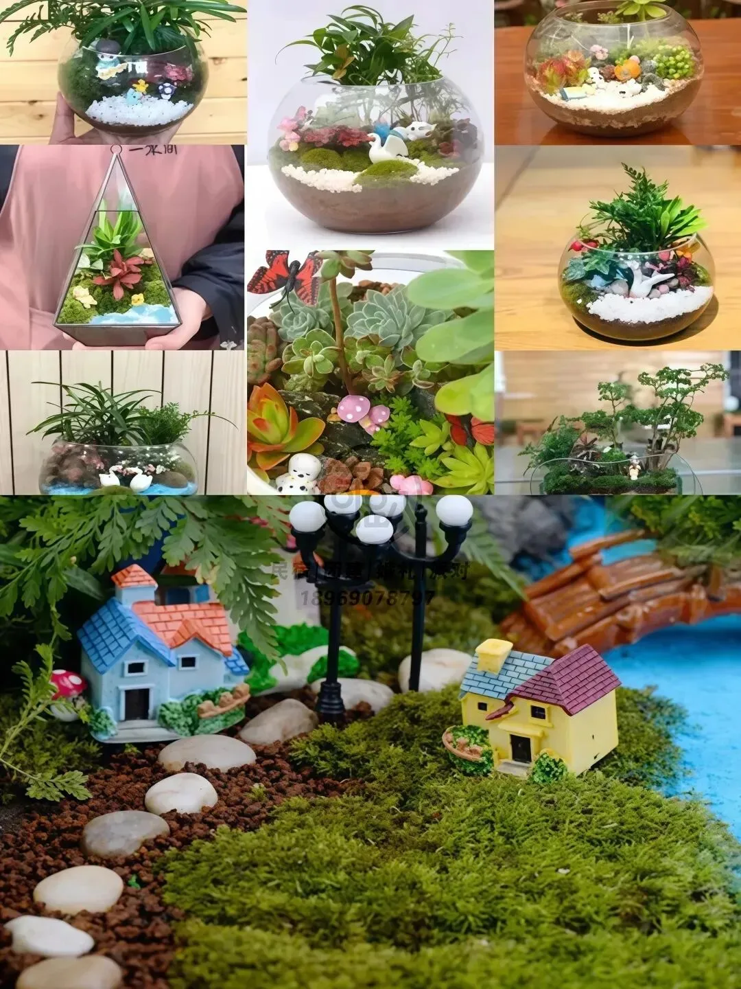 材料:玻璃容器、苔藓、多肉植物、小摆件、砂石、营养土、镊子等