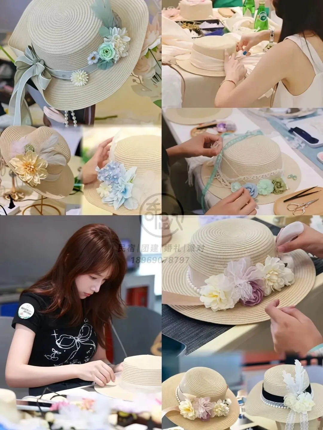 材料:草编/纸编礼帽基底、干花、丝带、珍珠、胶水、剪刀等