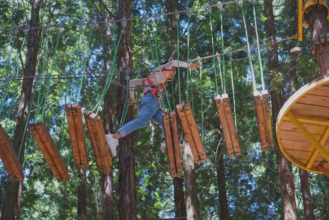丛林飞跃是集冒险、运动、娱乐、挑战于一体的户外运动项目,用各种各样的障碍环节将树连成一条线路,通过攀网道、荡秋千、走钢丝等方式进行树木间的探险。