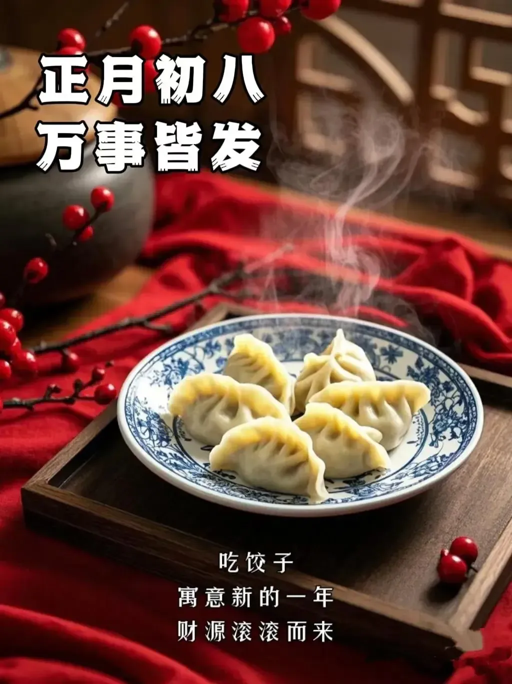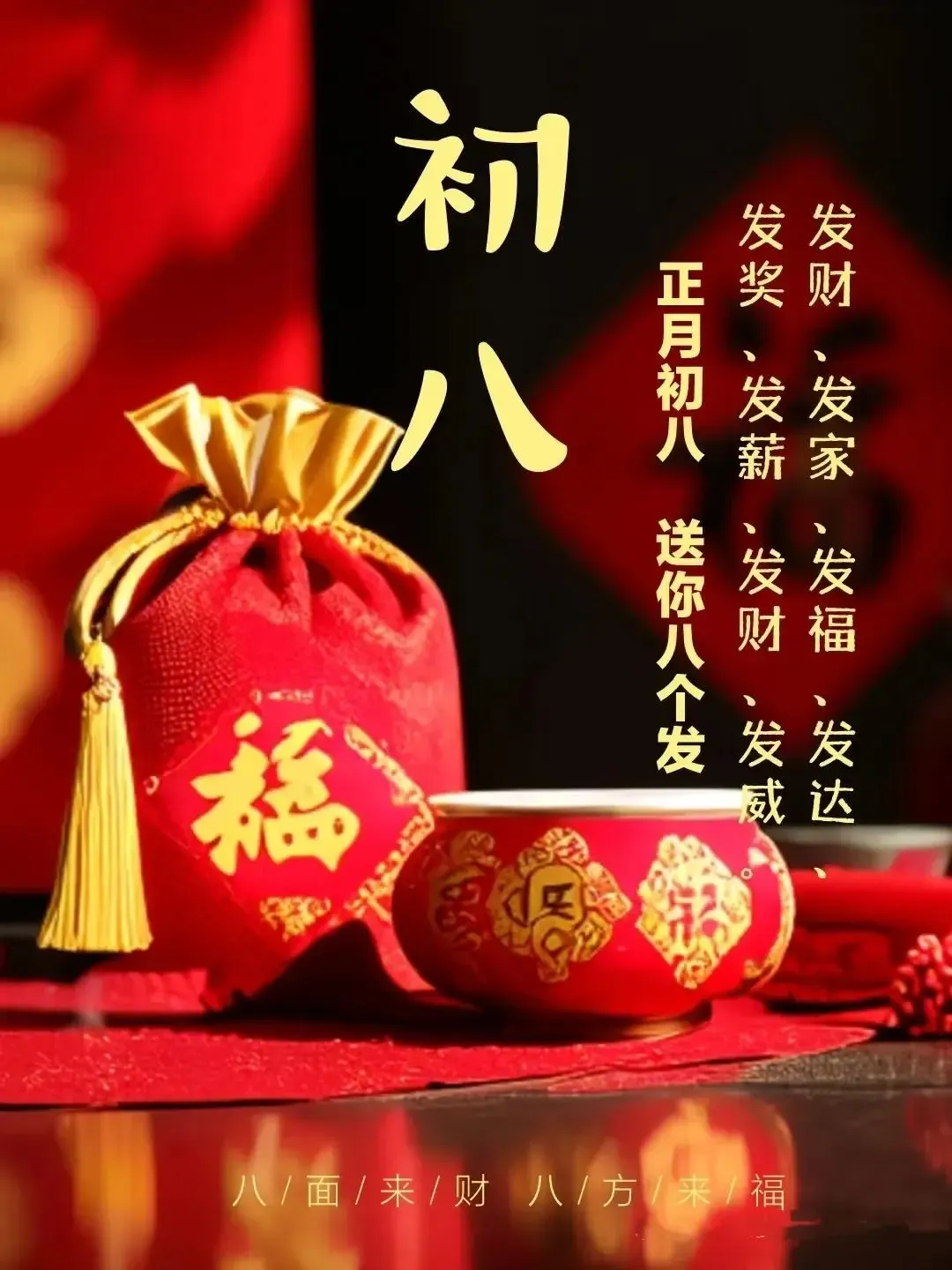 正月初八,诸事皆发,财源滚滚,福纳八方,身体健康,所遇皆欢喜,所得皆吉祥,顺风顺水顺财神!