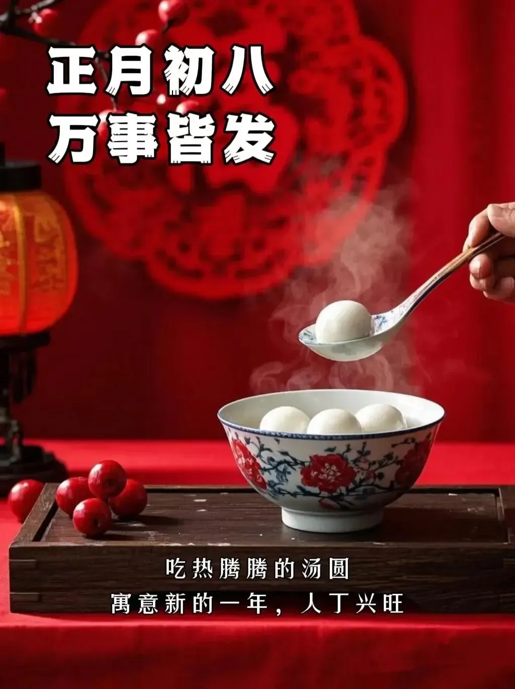 正月初八,送您全家八个发,祝您和家人,身体健康财运发,生活如意家人发,好运连连事业发,财源滚滚顺又发,顺风顺水顺财神,家和人旺万事发,祝您年年有余,岁岁福安,吉祥如意,八方来财,2026有钱花!
