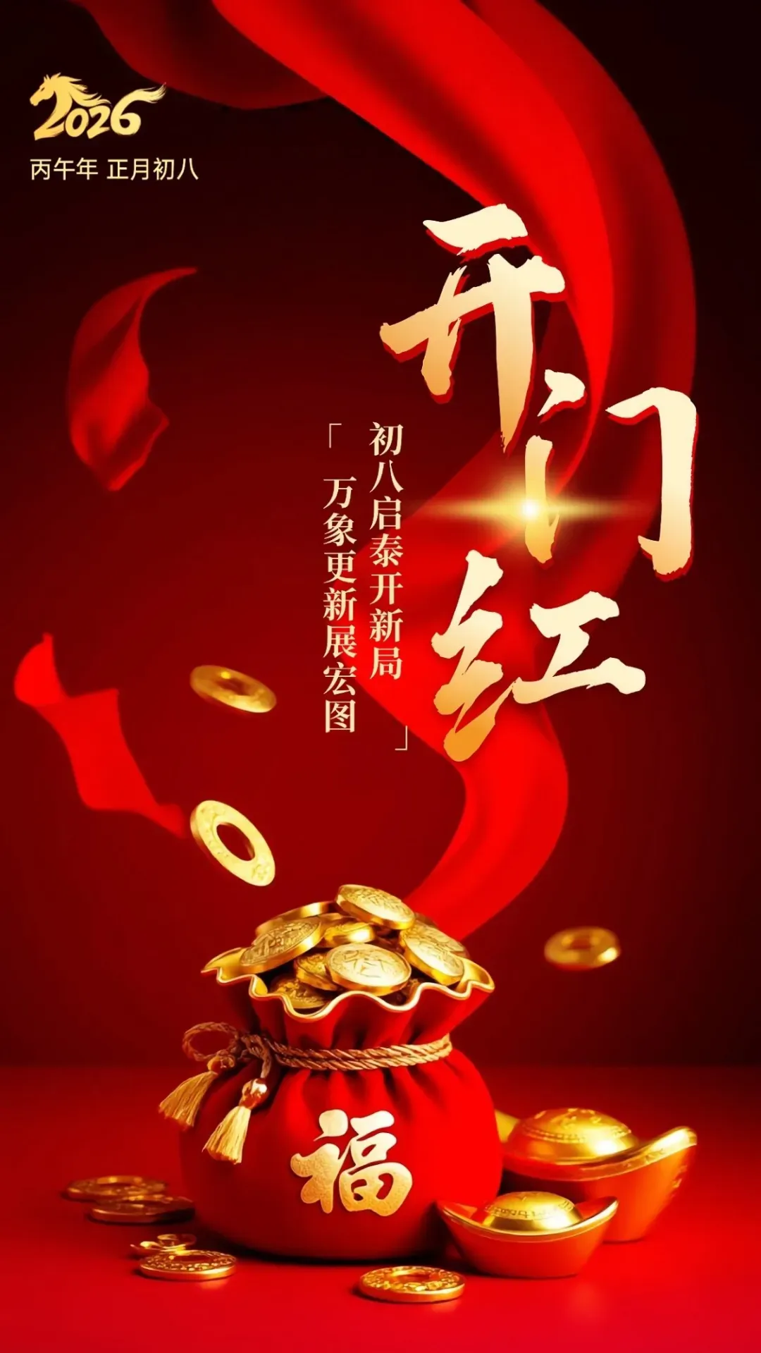 正月初八发财日,愿你2026精神振奋,信心百倍;开创未来,努力实干;业绩上升,工资翻倍;超越自我,梦想实现!祝新的一年事事如愿!初八快乐,早安吉祥!