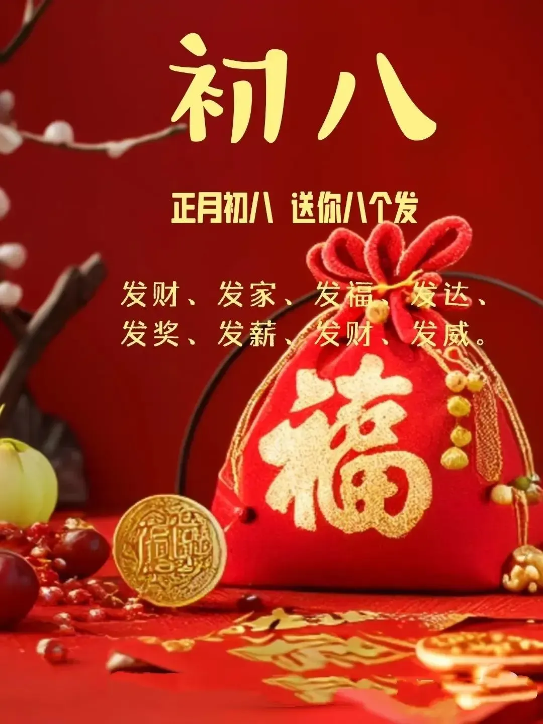 正月初八发发发,祝福大家一起发,五方财路进家门,红红火火一整年,福禄寿喜齐报到,金银财宝满腰包,天地和睦家添财,其乐融融乐开怀,愿你在新的一年里,富足安康,前程似锦,2026一路发发发!