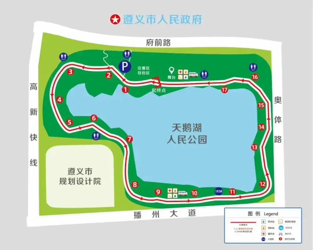 起点为天鹅湖公园北门(府前路入口),参赛选手需环天鹅湖公园健身步道跑完3圈.