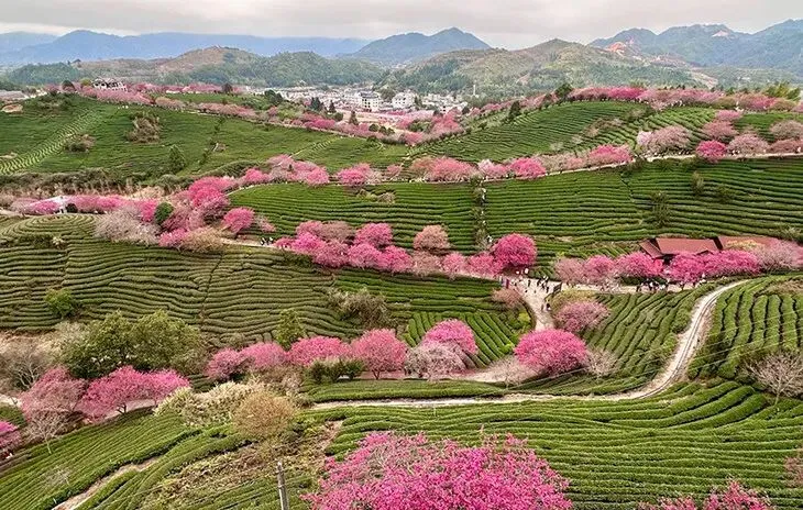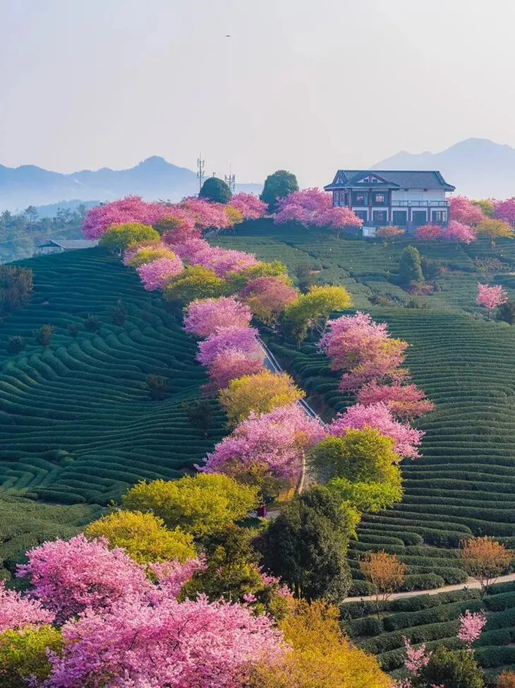 【永福樱花园】位于福建龙岩漳平市的永福镇,是一座以“茶田樱花”奇观闻名的高山花园。樱花园与万亩高山茶田交织,粉樱翠茶层层晕染,形成“樱花映茶山,春色入画屏”的奇幻景观,被誉为“中国最美樱花圣地”。樱花从1月底至3月下旬次第开放,涵盖绯寒樱、吉野樱、八重樱、云南樱等数十品种,花期长达两个月。融合闽台园艺技术,樱花与台式茶庄相辅相成,可体验“闽台共赏一山春”的独特人文风情。高山茶园 + 层层樱花 + 梯田花海是温暖、治愈的东方田园,漫山粉色樱花 + 翠绿茶垄,云雾缭绕、色彩柔和、像动画里的治愈世界, 自带童话感、治愈感、梦幻感。 这里是标准的宫崎骏式春日童话。