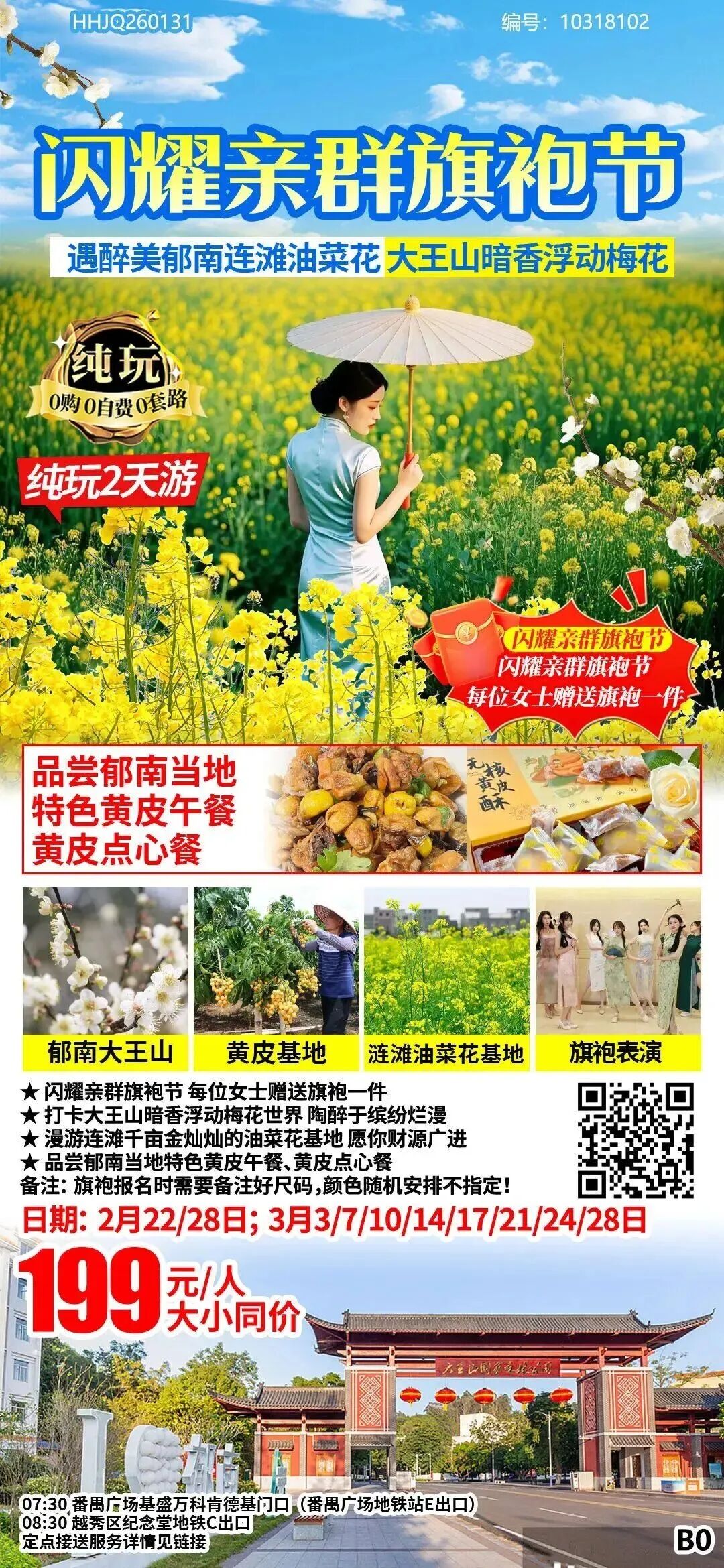 打卡郁南大王山观梅花2天💰199元/人 郁南纯玩2天🔥漫步千亩金黄油菜花田🥳每位女士赠送旗袍一件🉐品尝当地特色黄皮餐!!✅成团0228 已满✅成团0307 已满⭕0310 余位30⭕0314 余位30