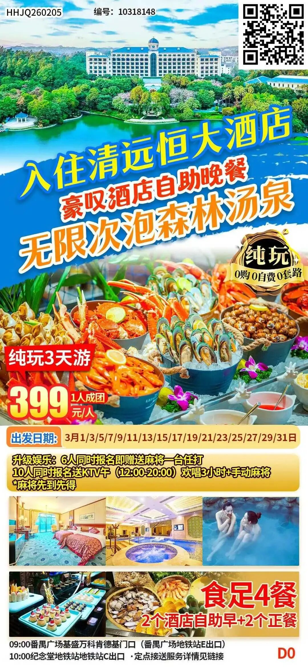 广州市区、番禺有上车点周末不涨价·连住2晚5钻¥399纯玩3天食足4餐*2自助早餐➕套餐晚餐➕豪叹海鲜自助晚餐入住欧式风格装饰的60㎡客房💦标准八道室内恒温泳池♨ 无限次泡森林汤泉6人同时报名麻将台1张不限时间任打