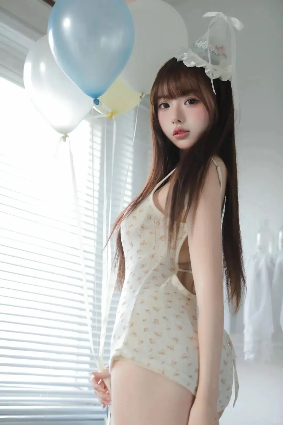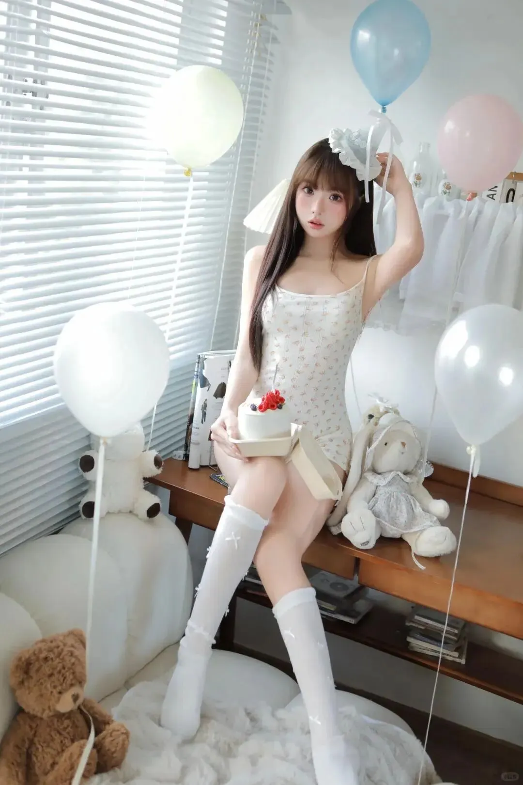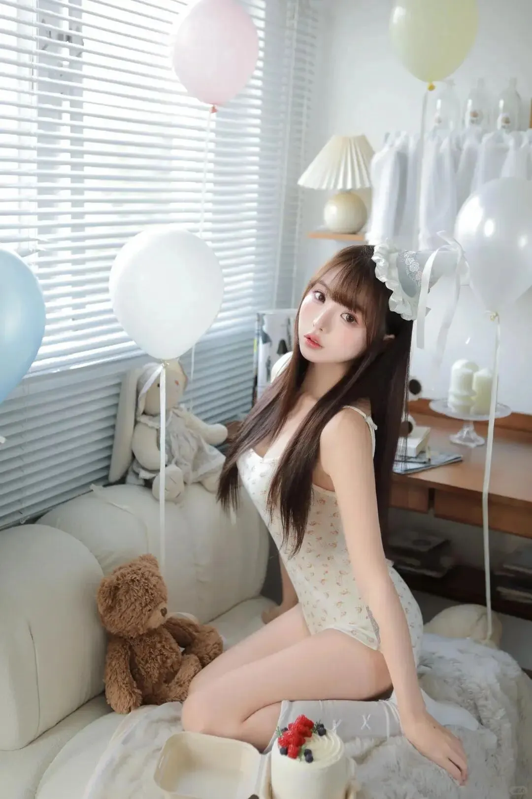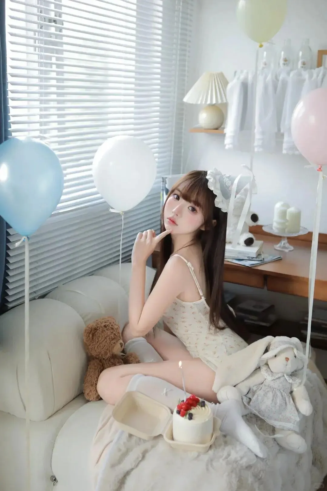 布置场景时她蹲在旁边帮我吹气球,圆滚滚的气球把她脸颊鼓成小包子,我忍不住伸手戳了戳,她“唔”了一声抬头瞪我,眼尾却弯成了月牙。正式拍摄时,她抱着奶油色的双层生日蛋糕,裙摆散开在毛绒地毯上,露出白皙的脚踝。我让她微微抬头,指尖轻触蜡烛火焰的边缘,她故意把指尖沾了奶油,然后凑到我面前晃了晃:“哥哥,你看。”我顺着她的手看过去,奶油在她粉嫩的指尖泛着光,鬼使神差地捏住她的手指,用拇指擦掉奶油,指尖不经意蹭过她的唇,她的脸瞬间红到耳根,连呼吸都慢了半拍,攥着裙摆的手指微微蜷缩。