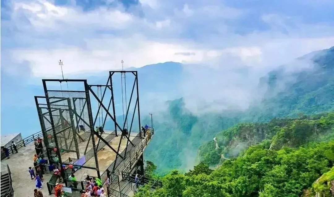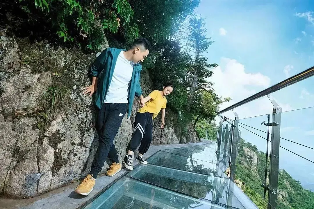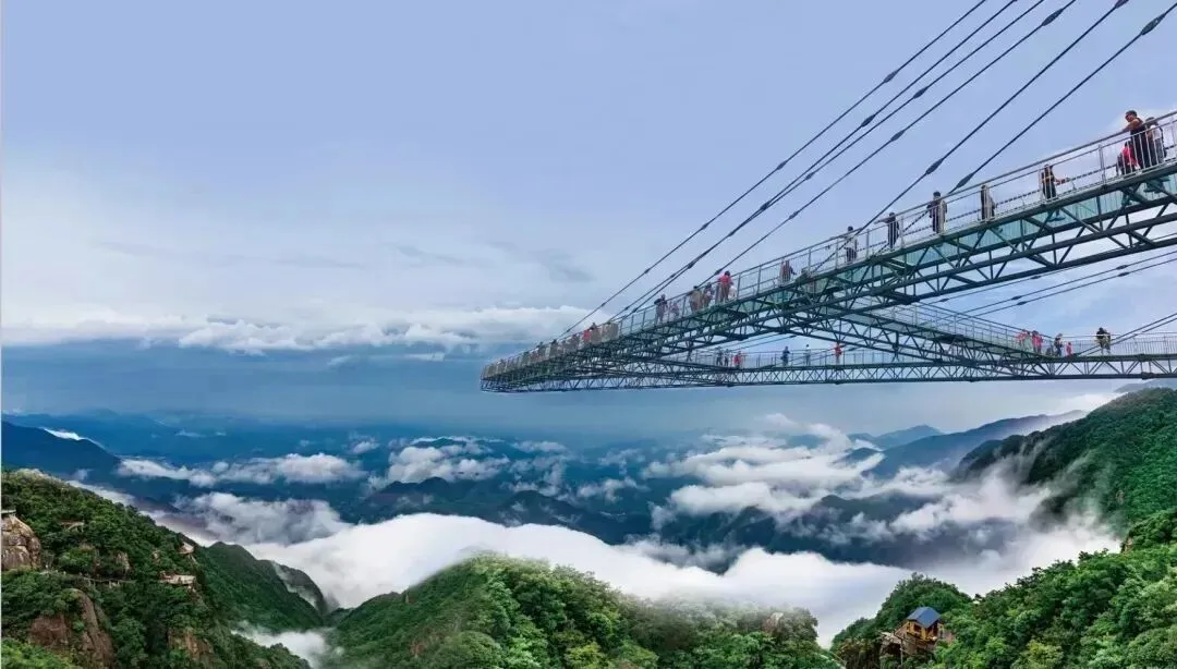 在1000多米海拔的悬崖峭壁之上,依攀山崖蜿蜒100米的玻璃栈道,踏云破雾。