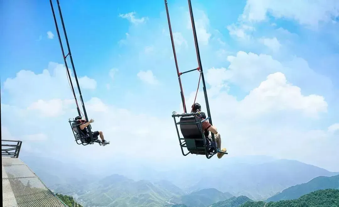 200米的悬崖顶荡秋千,秋千高度有4米、8米、18米。通过机械助推,将秋千拉升直至水平然后放下,挑战心魄。