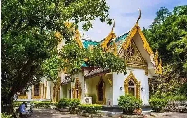 【泰佛殿】,泰佛殿位于东山路慧如公园对面山麓。在名城潮州建成的这座仿泰国云石寺的建筑物,极富泰国特色,重檐多面式屋顶装鱼鳞瓦、封檐板装向上的黄色图形,柱头翘角是龙凤呈祥之意,山墙的装饰、门窗的顶尖形集中了泰国古代的造型艺术,充分体现了雄奇、精巧的异国情调。