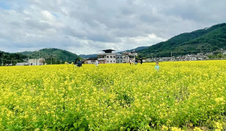 花田间点缀着白墙黛瓦的客家围龙屋,远山如黛,近水含烟,构成一幅典型的岭南春日画卷。
