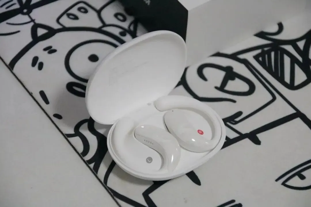 这款耳机戴着非常舒服,耳机单个的重量只有大约7克戴上去几乎没什么负担。耳挂采用医用级亲肤硅胶,加上轻压无感的结构设计,贴耳稳、受力也很均匀,长时间佩戴不会累耳,就算和眼镜一起佩戴的,也能够驾驭的住,戴着不会挤。