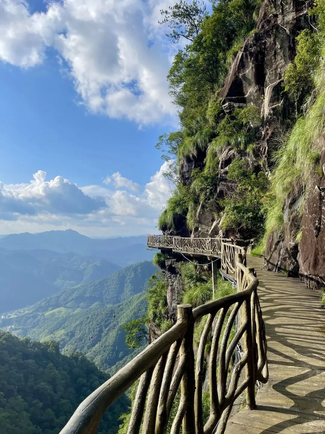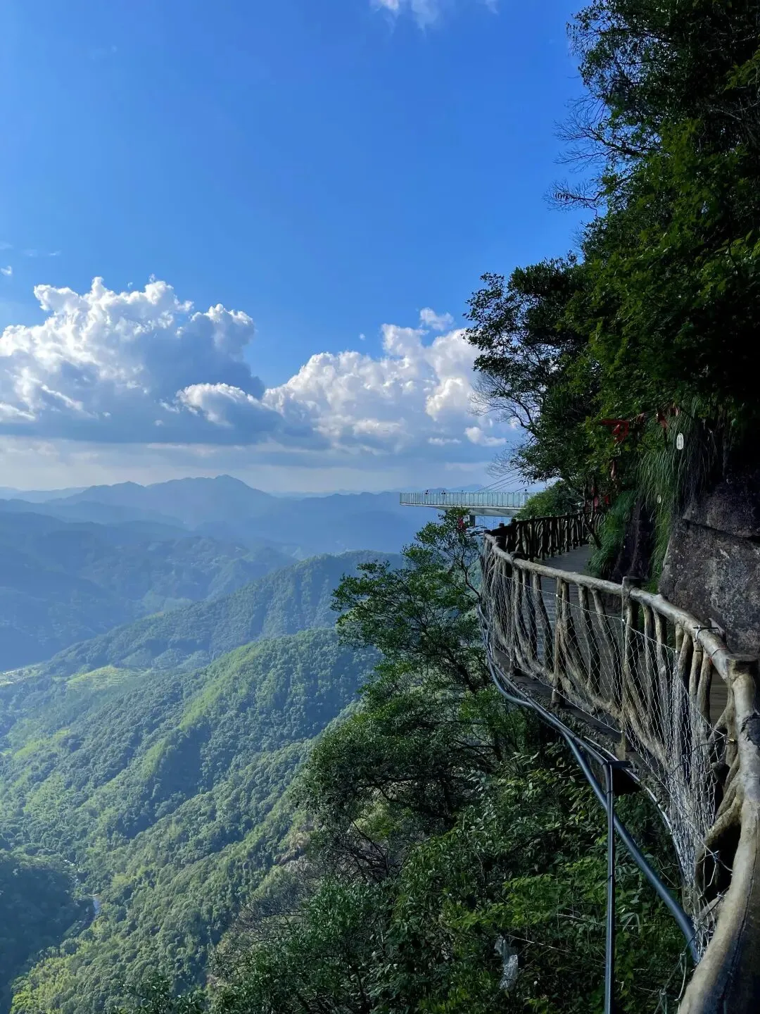 走在悬崖栈道上,凭栏探首,峭险渊深,令人心虚目眩。放眼望去,远处、不远处的山峰层峦叠嶂,由近及远,仿佛一幅色彩由浓及淡的中国水墨画。